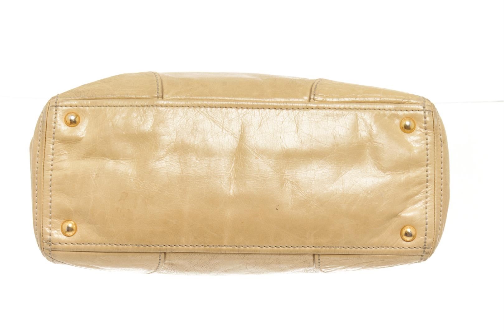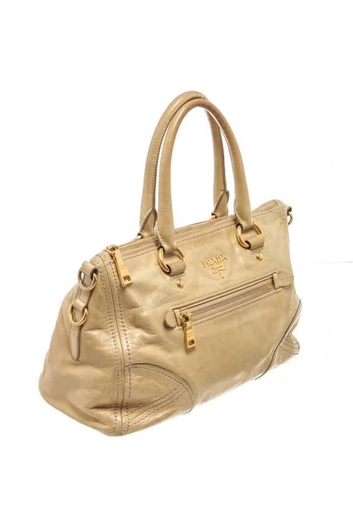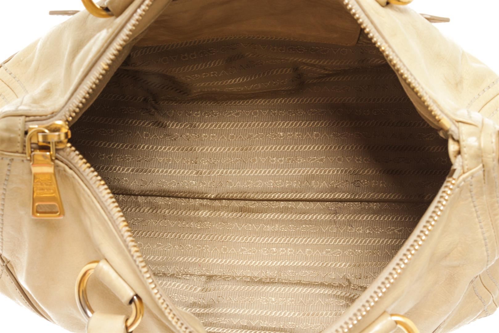 One Prada Light Yellow Beige Leather Shoulder Bag. Item is sold AS-IS. All available information is listed in the description and shown in the photo. Prada Light Yellow Beige Leather Shoulder Bag with top handle, exterior zipper pocket, Prada fabric lining, interior zipper pocket, gold tone hardware and zipper closure. There is a pen mark on the leather and the lining is heavily worn. Please refer to photos. Height:9.36 in, Length:15.8 in, Depth:5.85 in / 23.77 x 40.13 x 14.85 CM