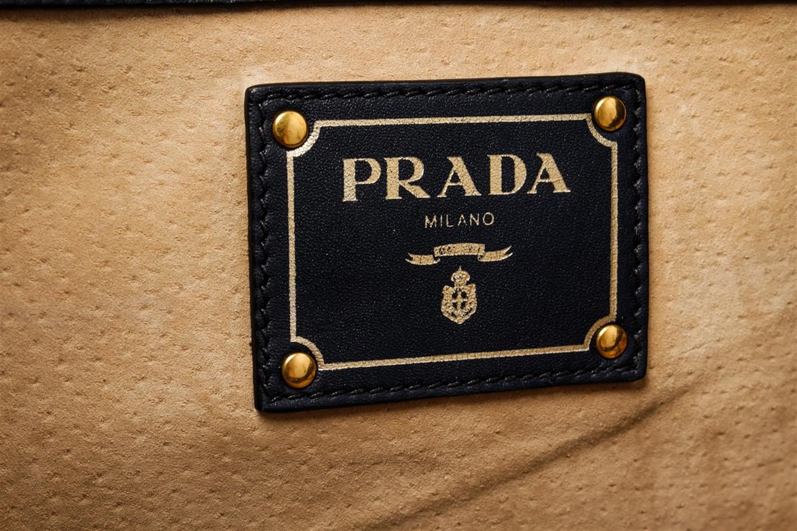Prada Navy Leather 2Way Shoulder Bag. All available information is listed in the description and shown in the photos. Prada Navy Leather 2Way Shoulder Bag with black leather, logo lettering, transparent id slot tag, concealed magnetic fastening, two top handles, internal zip pocket, internal logo patch, leather lining, gold-tone hardware, square body. Height: 14.5" Width: 16.9" Depth: 1.57", Handle Drop: 5.11" / 37 x 43 x 4 Cm