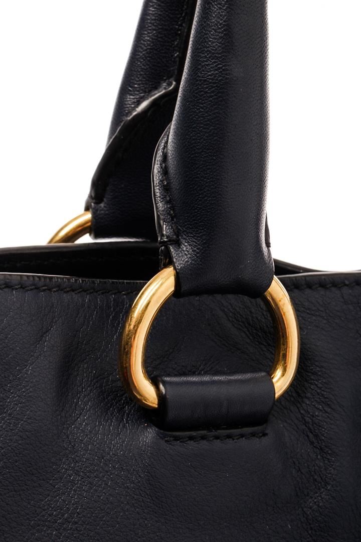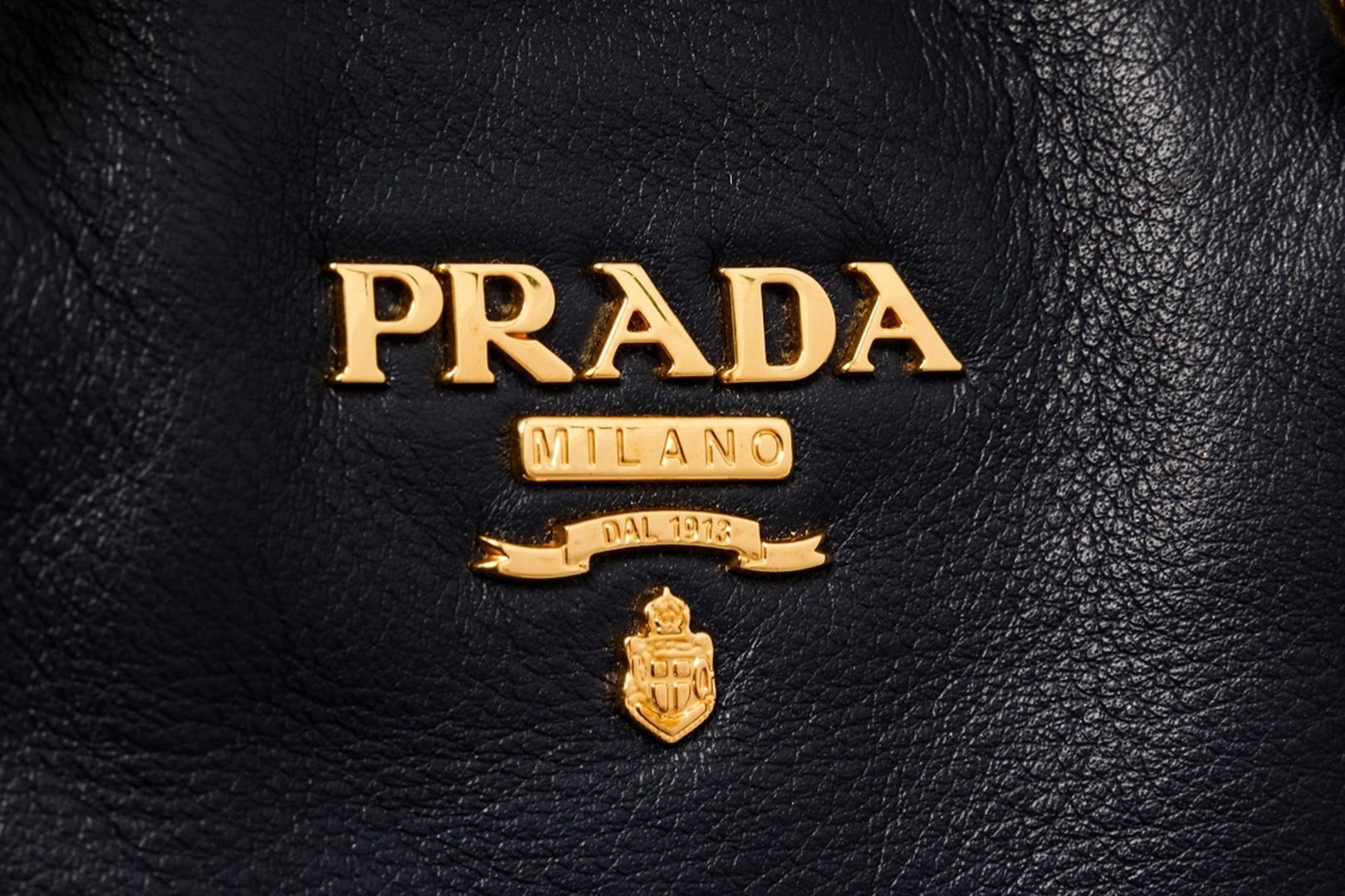 Prada Navy Leather 2Way Shoulder Bag. All available information is listed in the description and shown in the photos. Prada Navy Leather 2Way Shoulder Bag with black leather, logo lettering, transparent id slot tag, concealed magnetic fastening, two top handles, internal zip pocket, internal logo patch, leather lining, gold-tone hardware, square body. Height: 14.5" Width: 16.9" Depth: 1.57", Handle Drop: 5.11" / 37 x 43 x 4 Cm