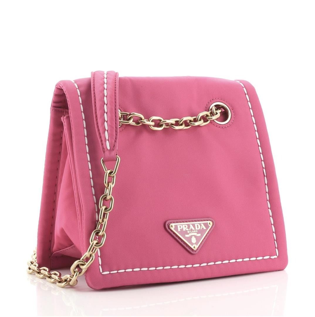 Prada Padded Chain Flap Bag Tessuto Small Pink Condition Details: Minor wear on flap edge and in interior base, scratches on hardware. Height 6.5", Width 7.5", Depth 4", Strap Drop 22