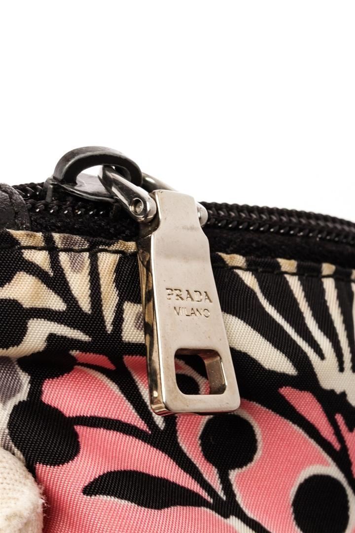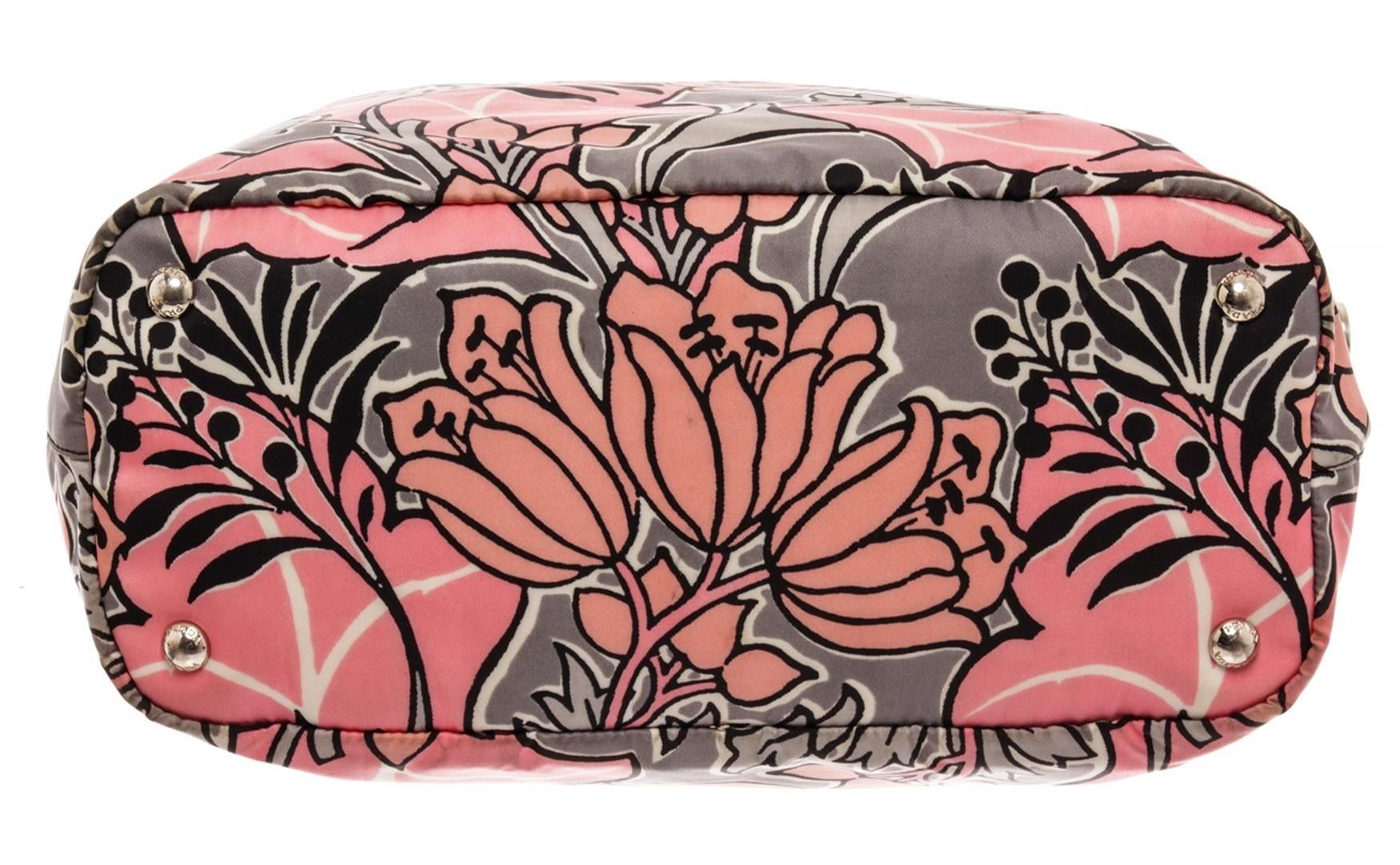 Prada Pink Nylon Saffiano Tessuto Flower Print 2Way Tote Bag. All available information is listed in the description and shown in the photos. Prada Pink Nylon Saffiano Tessuto Flower Print 2Way Tote Bag with it features black saffiano calfskin leather handles, an adjustable nylon shoulder strap and silver hardware. the top zipper opens to a spacious prada logo jacquard fabric interior with zipper and patch pockets. Height: 13.50" Width: 5.75" length: 16.00", Drop: 7.75-12.00" / 34.29 x 14.60 x 40.64 Cm