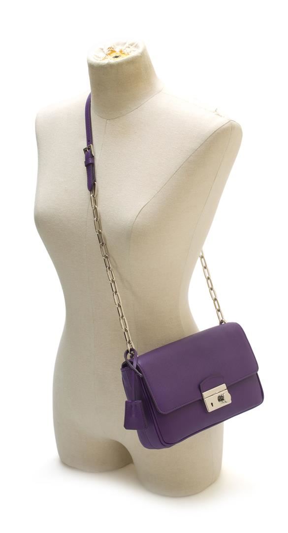 Stylish purple Prada saffiano leather flap bag. This designer shoulder purse is compact, and has enough space to fit your wallet, phones, lipstick, and other small items. Exterior L Chain, Leather Strap, and covered key charm. 1 interior zipper pocket. Clasp closure. Includes key for front lock. Rear flat pocket. H5.5"xW9.5"xW2". Made in Italy. This is a brand new bag.