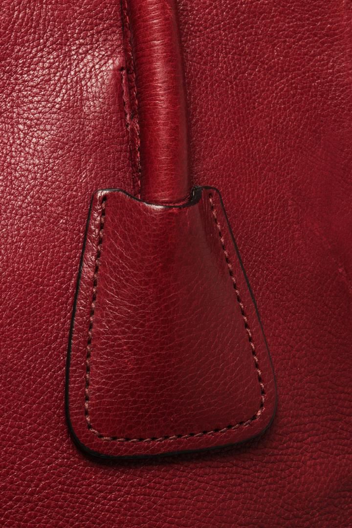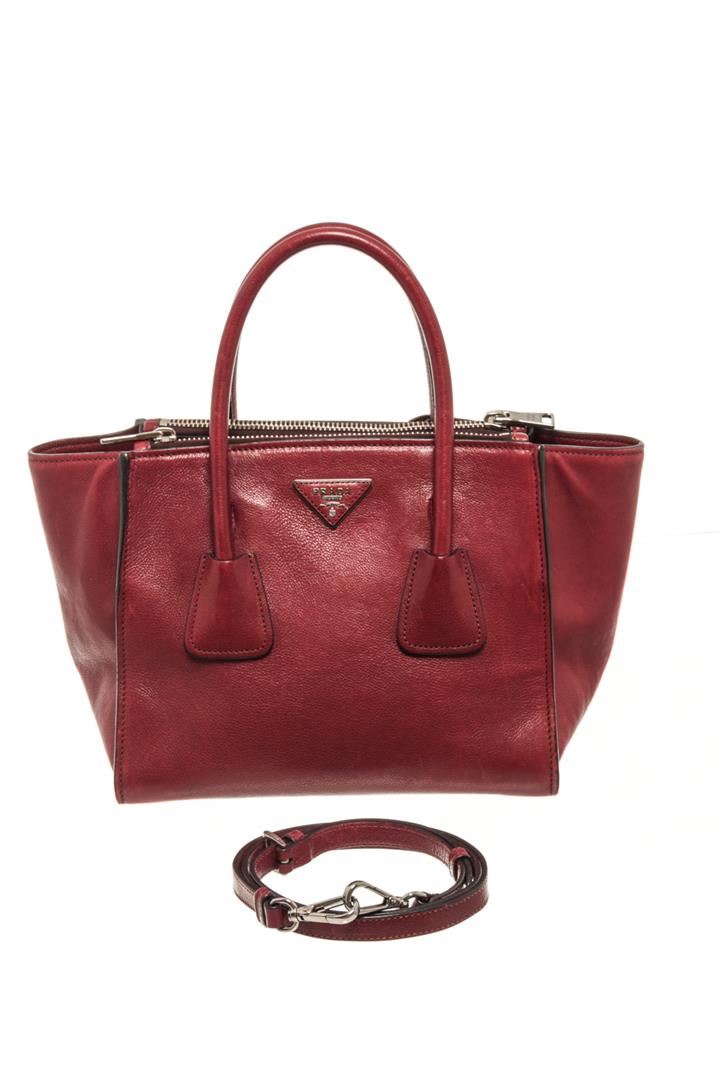 One Prada Red Calf Twin Pocket Tote Bag. Item is sold AS-IS. All available information is listed in the description and shown in the photo. Prada Red Calf Twin Pocket Tote Bag with top handle, detachable adjustable strap, Prada fabric lining, Prada pocket interior, silver tone hardware, zipper/snap closure. Height: 10.5" Width: 8" Depth: 11", Handle Drop: / 26.67 x 20.32 x 27.94 Cm
