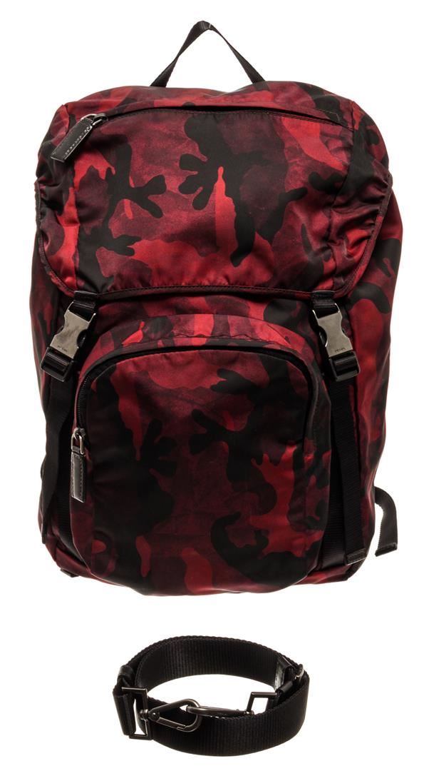 One Prada Red Camouflage Tessuto Backpack. Item is sold AS-IS. All available information is listed in the description and shown in the photo. Prada red camouflage tessuto backpack with adjustable straps, one exterior zipper pocket on the top flap, one exterior zipper pocket on the front, double buckle, and drawstring and flap closure.