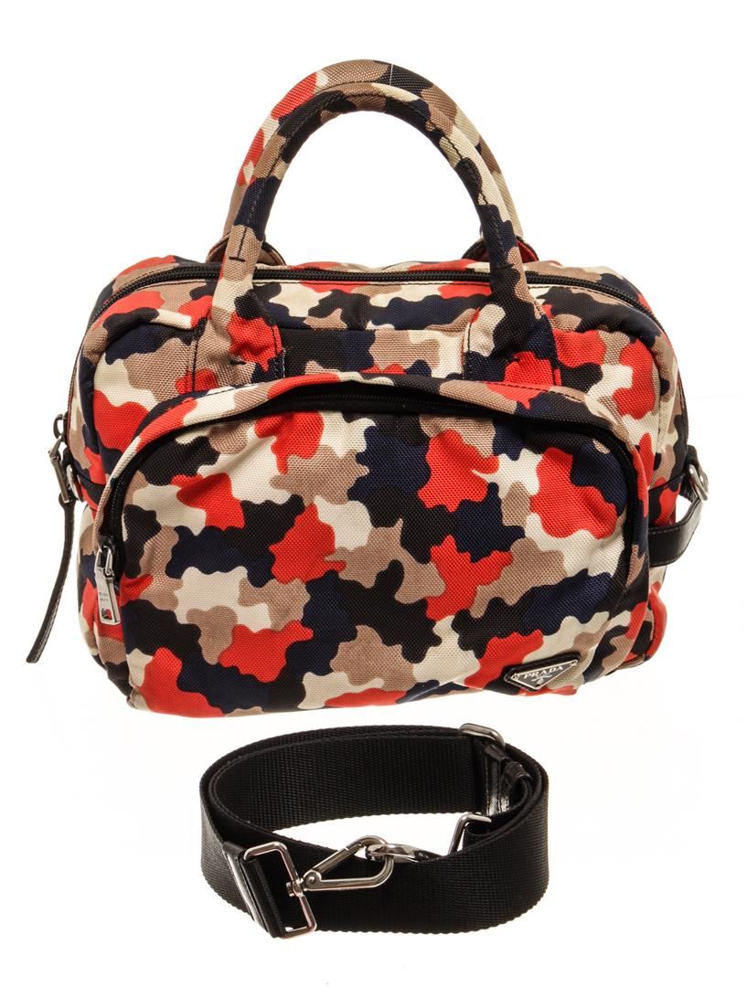 One Prada Red Multicolor Canvas Zip Around Small Satchel Bag. Item is sold AS-IS. All available information is listed in the description and shown in the photo. prada red multicolor canvas zip around small satchel bag with creasing and minor wear on exterior, moderate stain on base, discoloration on handles. minor splitting on zipper pull wax edge, pilling along zipper tape, scratches and tarnish on hardware. Height: 8 in (20.32 cm), Width: 6 in (15.24 cm), Depth: 12 in (30.48 cm)