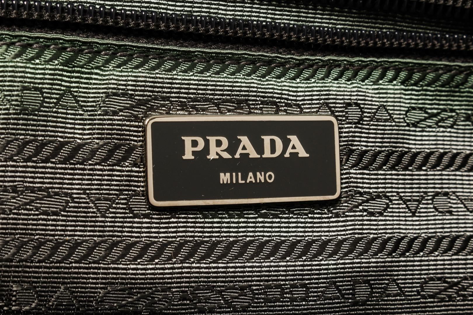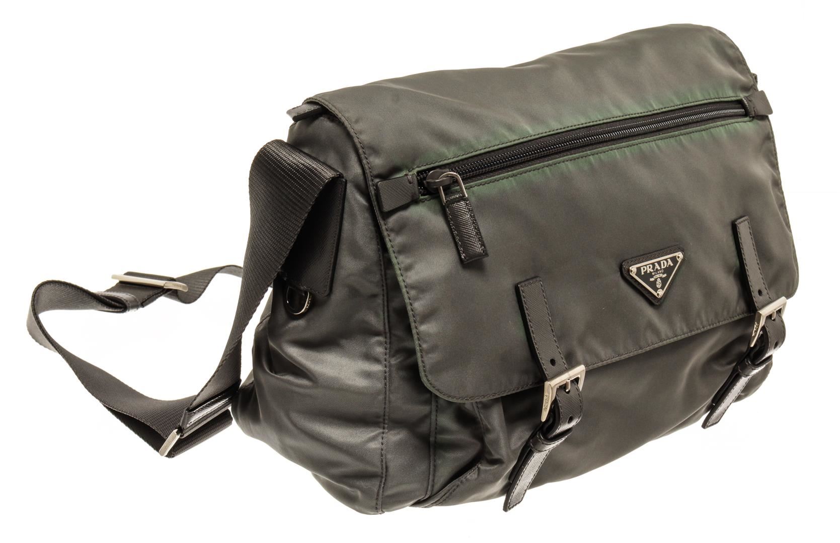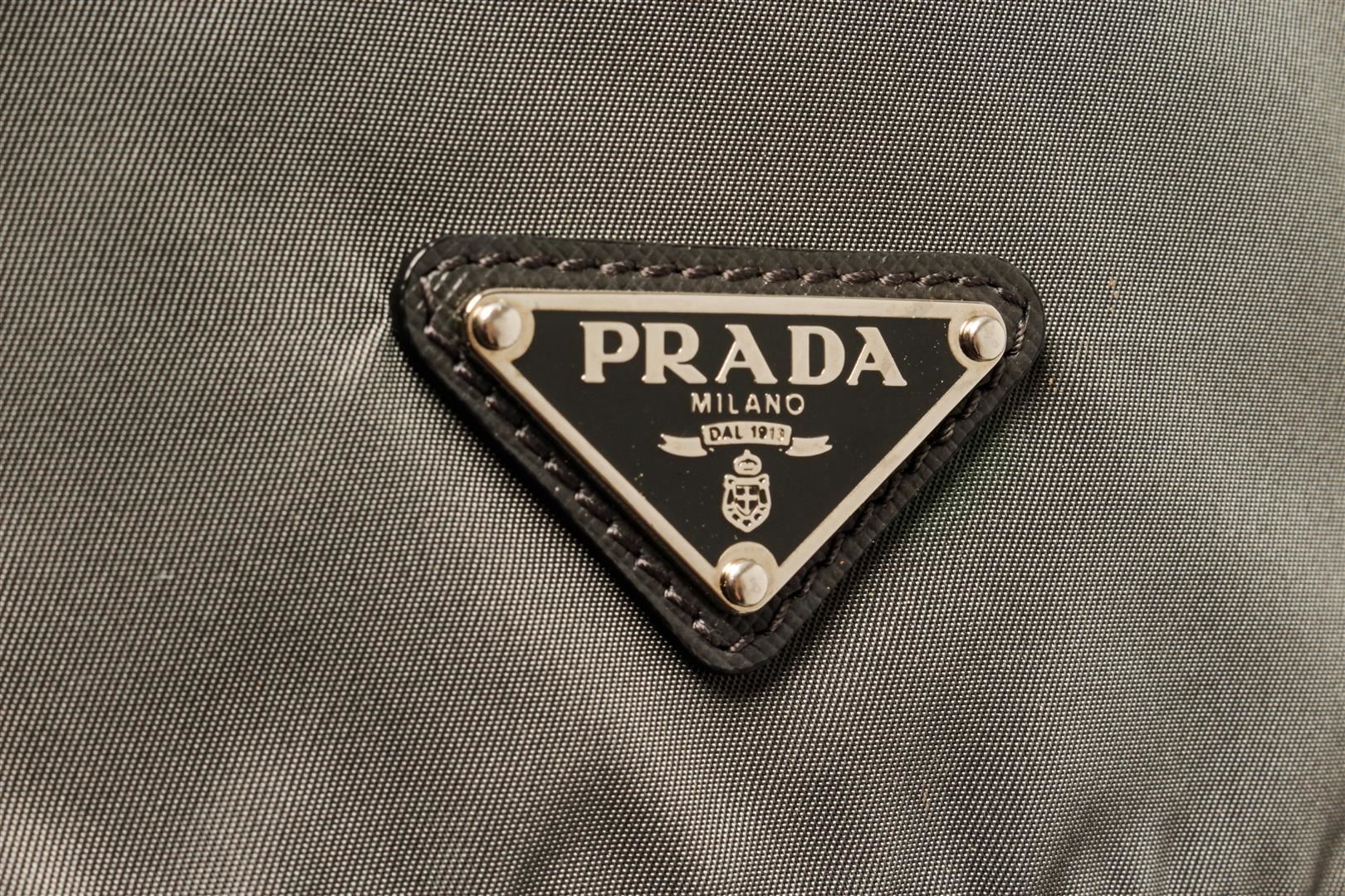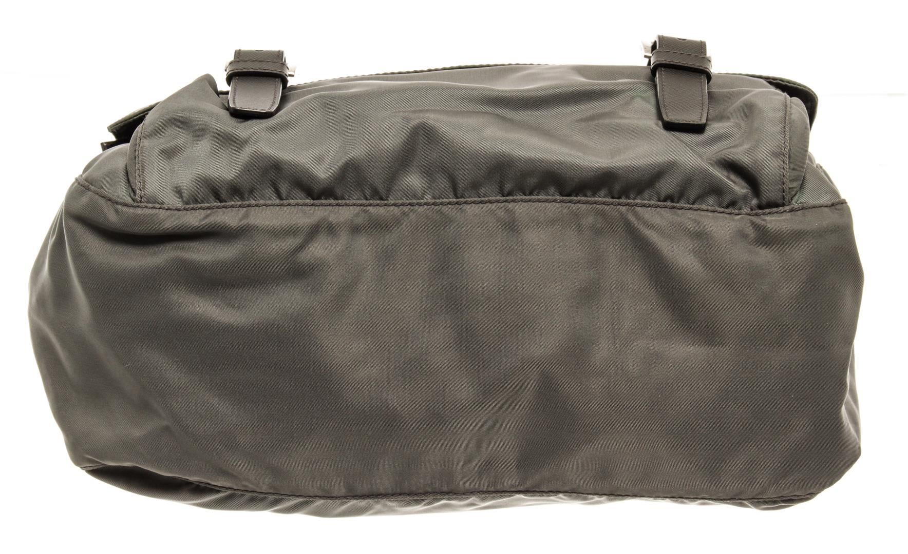 One Prada Vintage Grey Nylon Messenger Bag. Item is sold AS-IS. All available information is listed in the description and shown in the photo. Prada vintage grey nylon messenger bag with zipper, flap, and buckle closure; two exterior zip pockets (one on the flap, one under the flap), one interior zip pocket, adjustable long strap, silver-tone hardware, and black fabric lining.