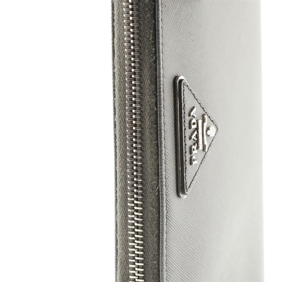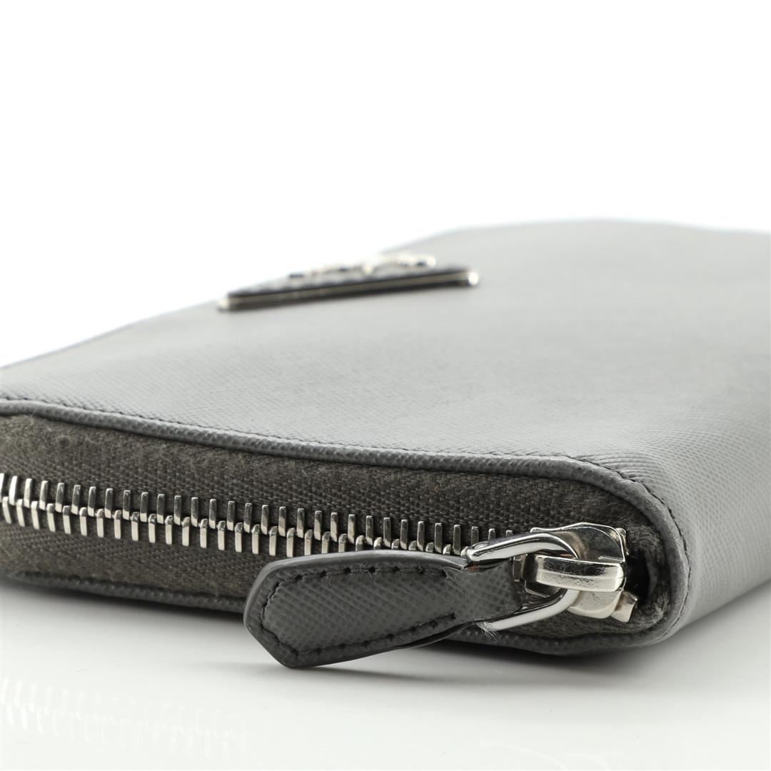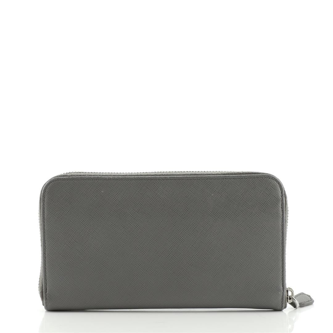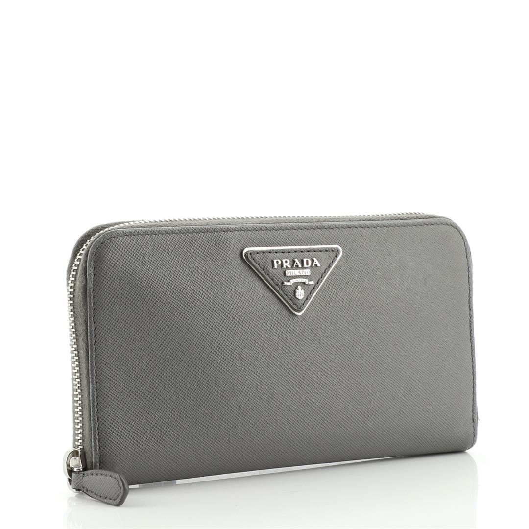 Prada Zip Around Wallet Saffiano Leather Long. Wear on exterior corners, pilling and wear on zipper tape, heavy peeling and splitting on zipper pull wax edges. Light scuffs in interior, scratches on hardware.