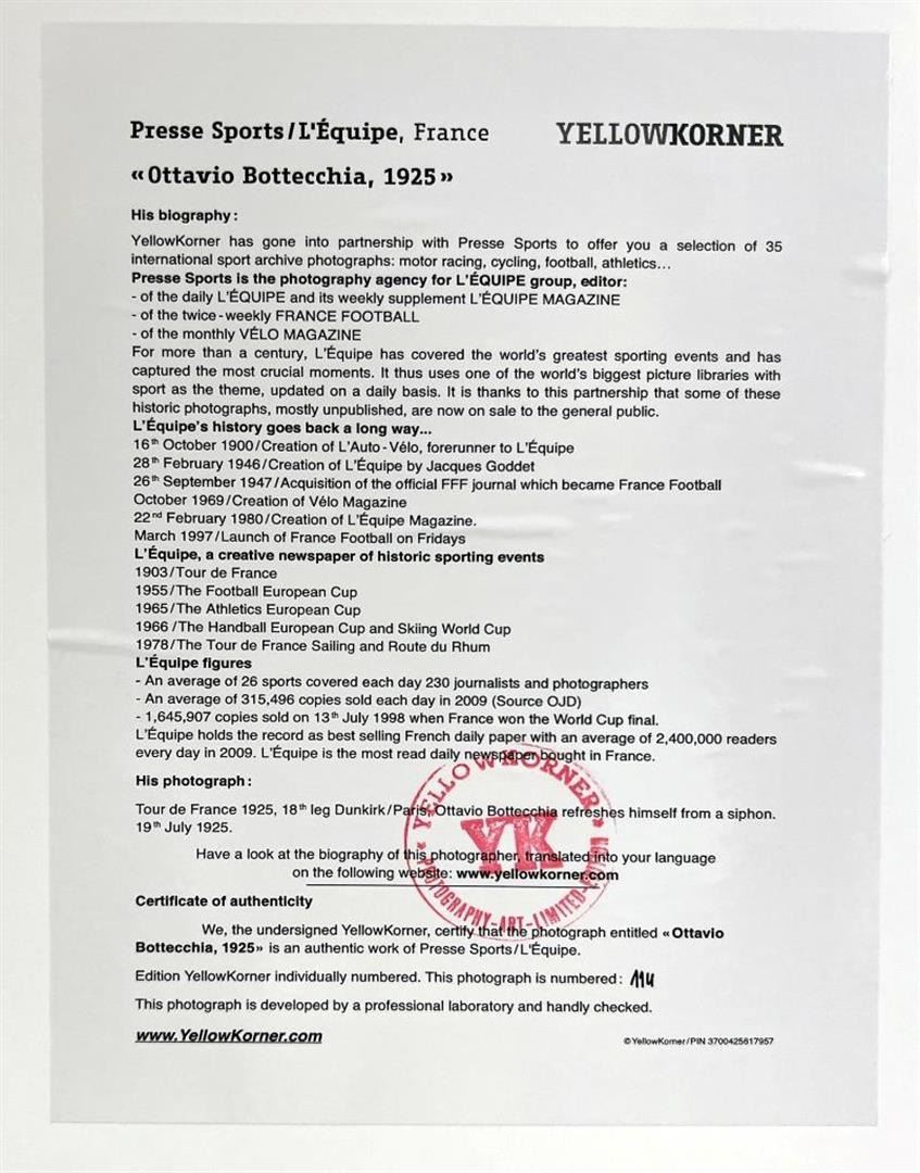 Team Tour de France Presse Sport Ottavio Bottechia 1925 YellowKorner Certified Photograph. Certificate of Authenticity from YellowKorner affixed to the back. Matted Dimensions 16"x20". Protected with Clear Mylar Sleeve.