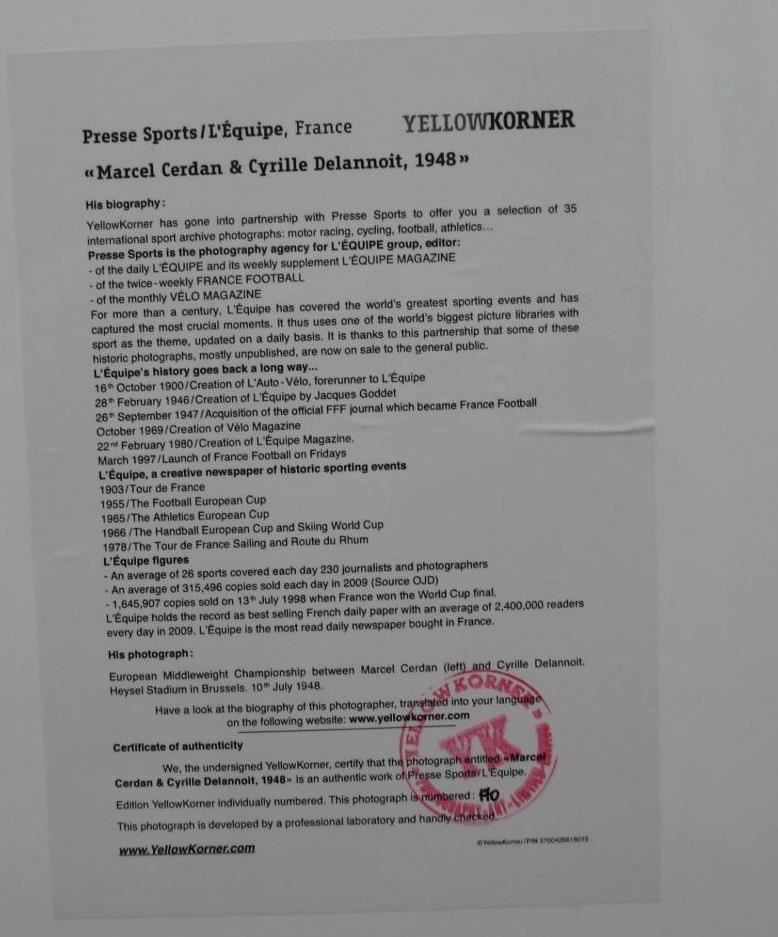 Marcel Cerdan & Cyrille Delannoit, 1948 Certified Photograph, Presse Sports/L'Equipe YellowKorner Certified Photograph. Certificate of Authenticity from YellowKorner affixed to the back. Matted Dimensions 16"x20". Protected with Clear Mylar Sleeve.