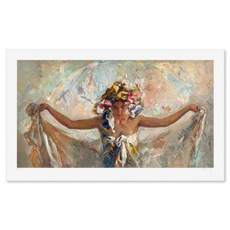 "Prima Luce" is a limited edition printer's proof serigraph on paper by Royo, numbered 1/10 and hand signed by the artist. Includes Letter of Authenticity. Measures approx. 30" x 50" (border), 25" x 45" (image).