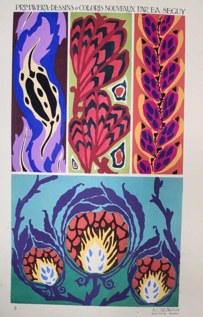 This rare Primavera: Dessins & Coloris Nouveaux by the renowned French designer E.A. Seguy, published by A. Calavas in Paris (1913?), features vibrant and intricate Art Nouveau designs. Original cloth portfolio with 20 richly colored loose plates, it highlights Seguy's mastery of bold floral and geometric patterns, embodying the elegance and innovation of early 20th-century decorative arts. The pages display natural aging, but the overall condition is excellent, making this a valuable addition for collectors, designers, and lovers of Art Nouveau. Each plate is approximately: Height: 21.25 inches (54 cm) Width: 15.75 inches (40 cm)
