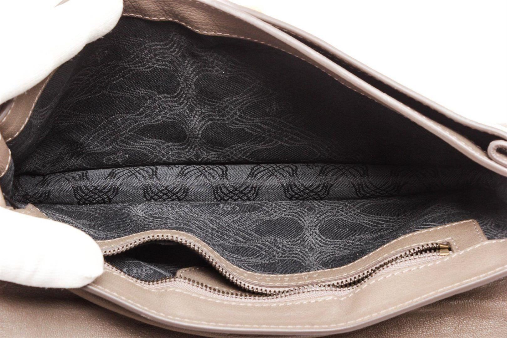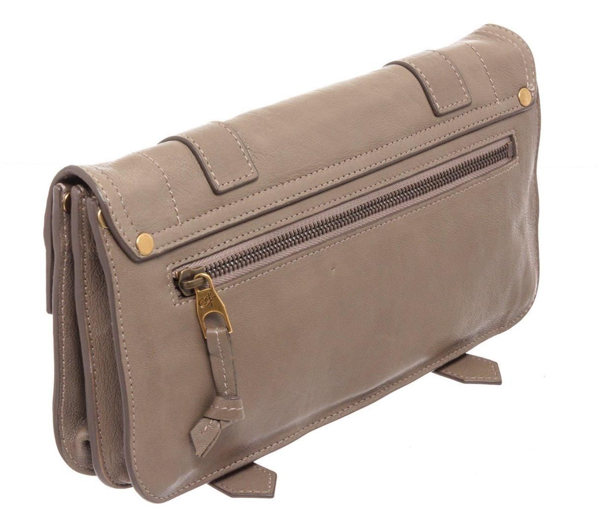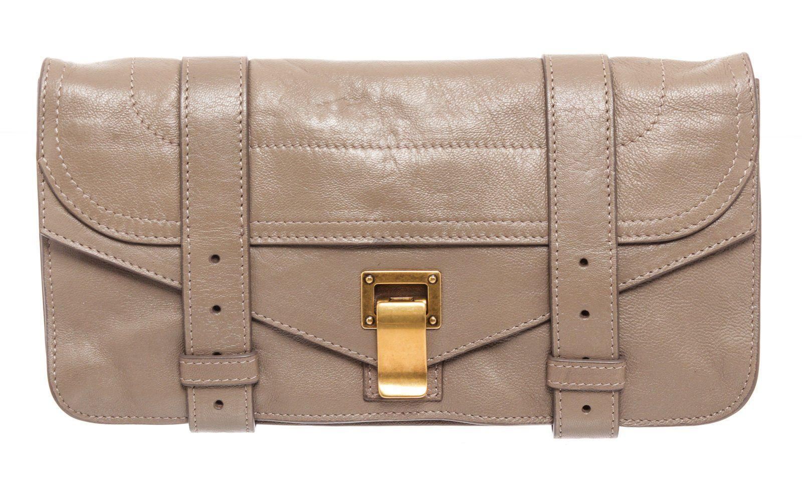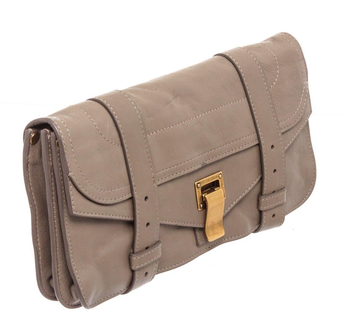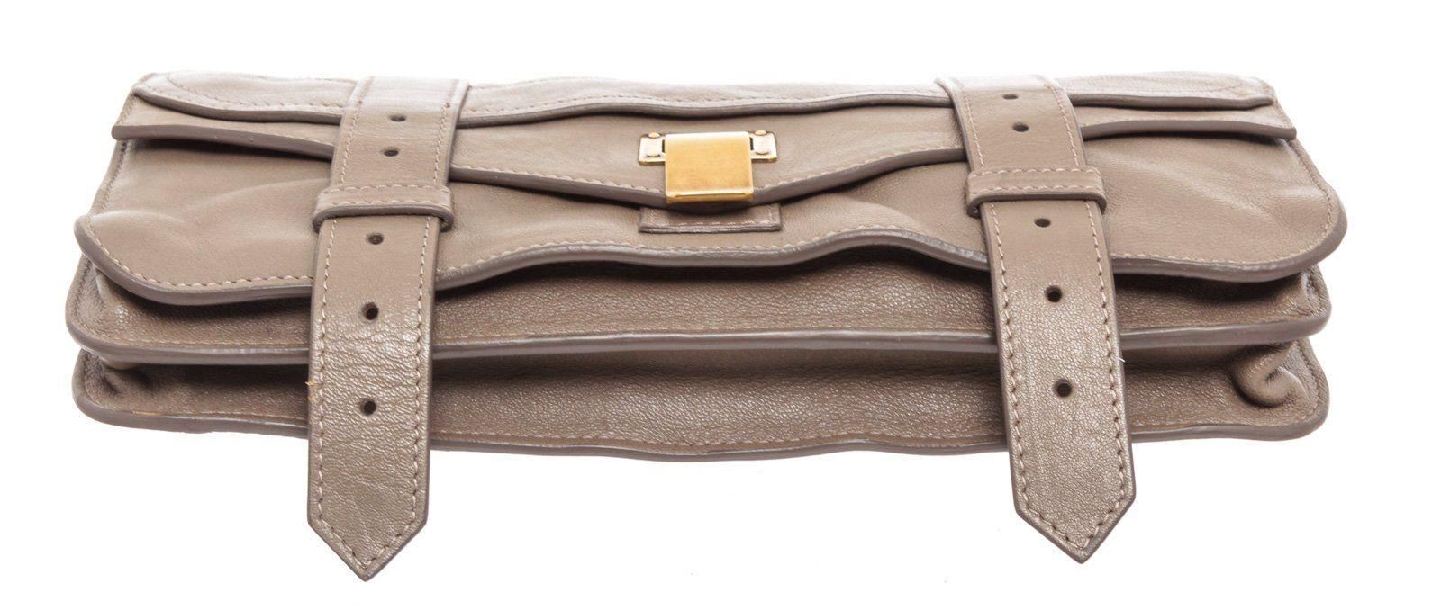 Proenza Smoke PS1 Pochette Taupe Schoulder Clutch with gunmetal hardware, single slip pocket at exterior with flap, snap closure. Interior is leather lined and contains three large slip pocket; one with zip closure and eight credit card slip pockets. Overall zip around closure. MEASUREMENTS: Length 7.25 in / 18 cm Width 0.75 in / 2 cm Height 4 in / 10 cm Condition: Pre-Owned Good overall, please see photographs for detail.