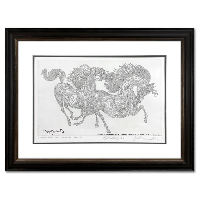 "Progression" is a one-of-a-kind cancellation proof with its corresponding copper plate by Guillaume Azoulay. The etching is numbered 1/1 and hand signed by the artist. Includes Letter of Authenticity. Each piece measures approx. 33" x 25" (frame), 22.5" x 14.5" (image).
