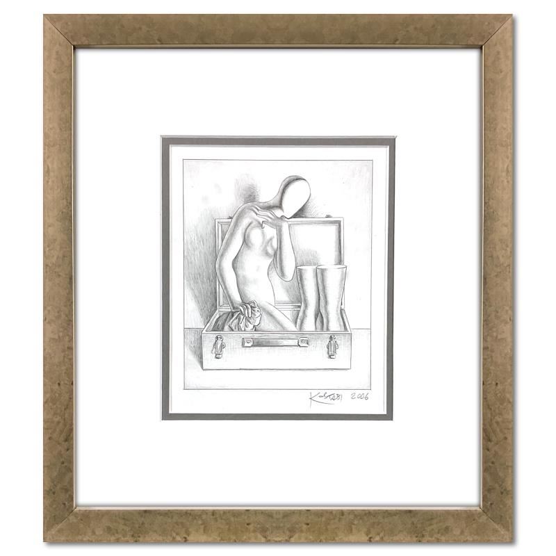 "Psychic Baggage Claim" is an original drawing on paper by Mark Kostabi, dated 2006 and hand signed by the artist. This piece comes custom framed. Includes Certificate of Authenticity. Measures approx. 14" x 15.5" (frame), 5.5" x 7" (image).