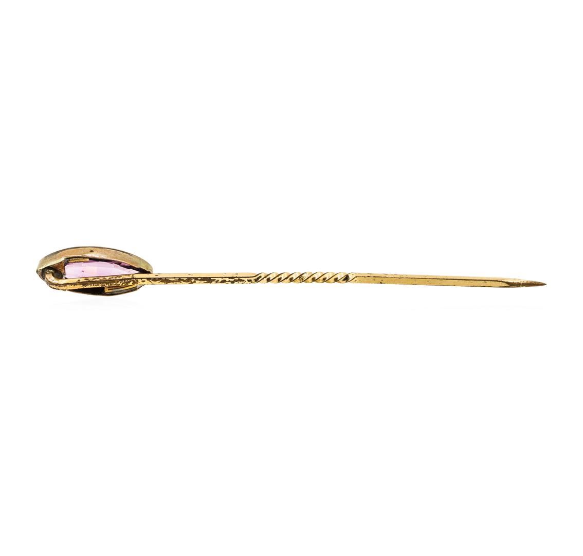 One yellow gold plated stick pin weighing 0.7 grams containing one purple crystal.