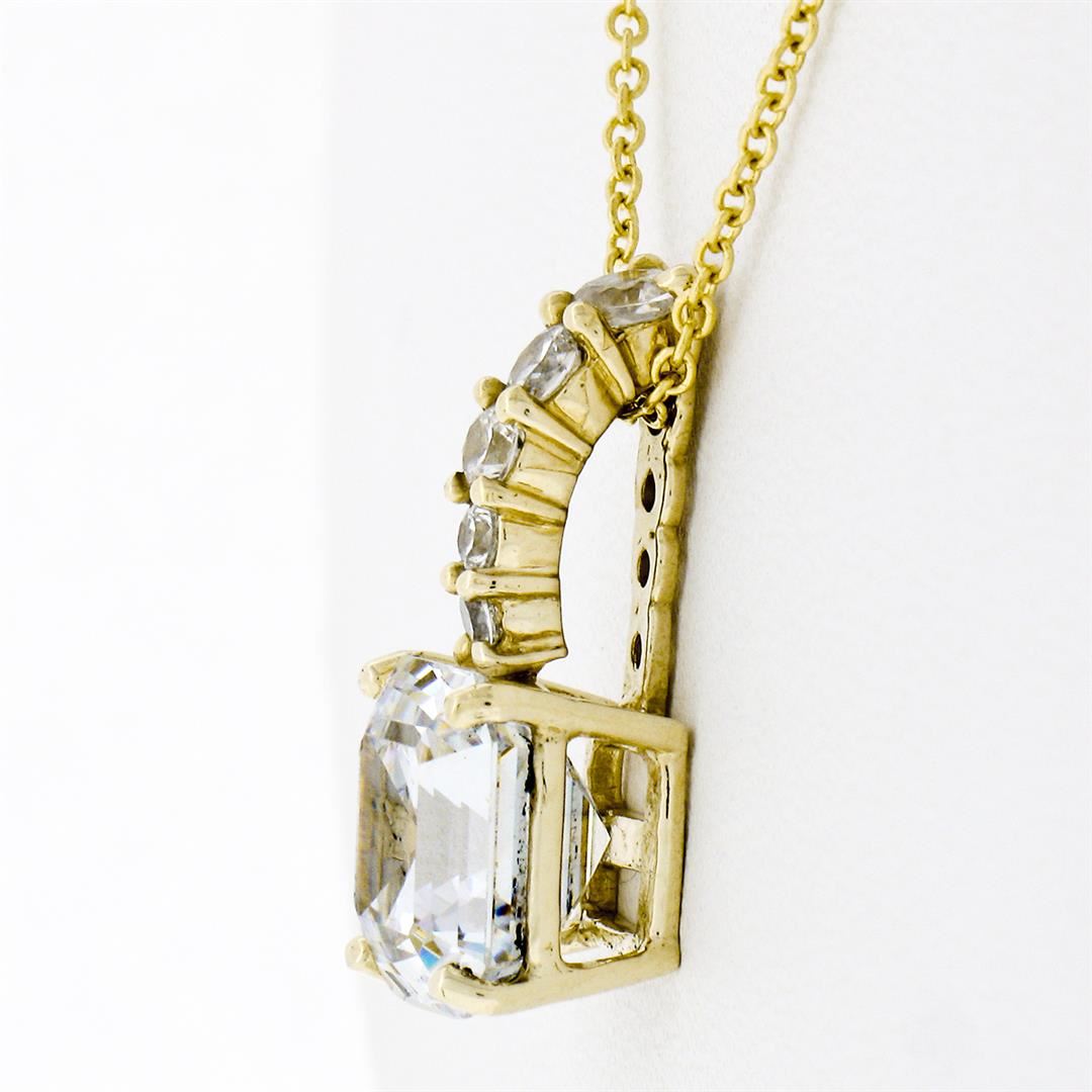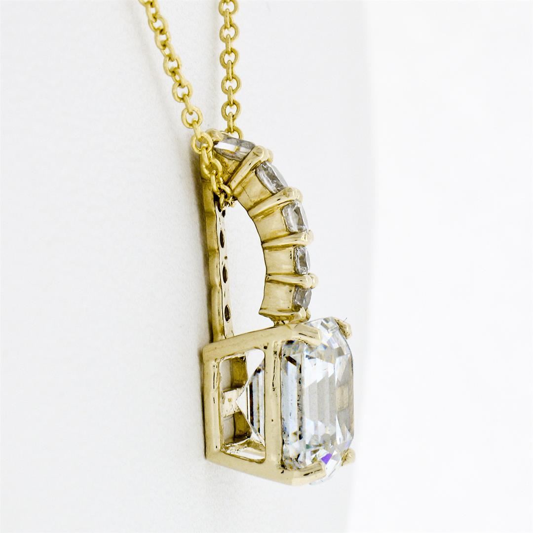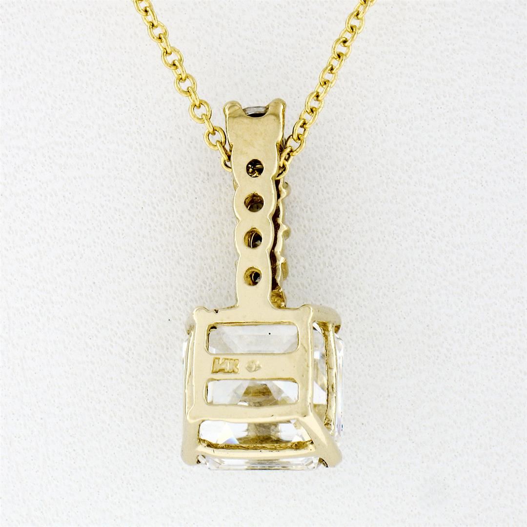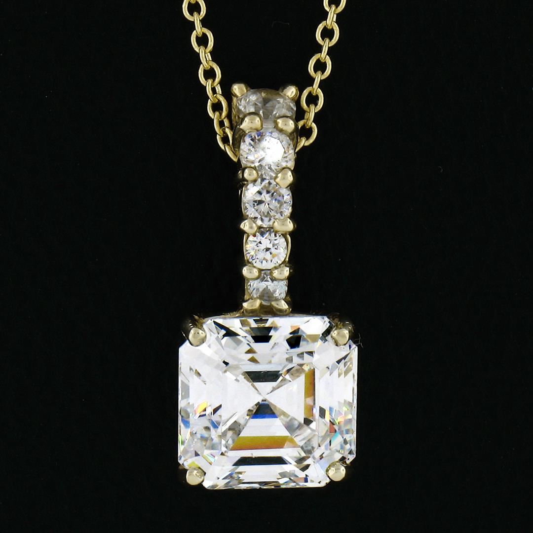 An estate solid 14k yellow gold solitaire pendant necklace, with 1 asscher cut cucic zircon (9.10x9.05mm), and 5 round brilliant cut cubic zircon ( 2.35mm to 3.0mm). The pendant weighs a total of 4.74 grams, measures 20.45x9.10mm including the bail, 18 inch cable link chain.