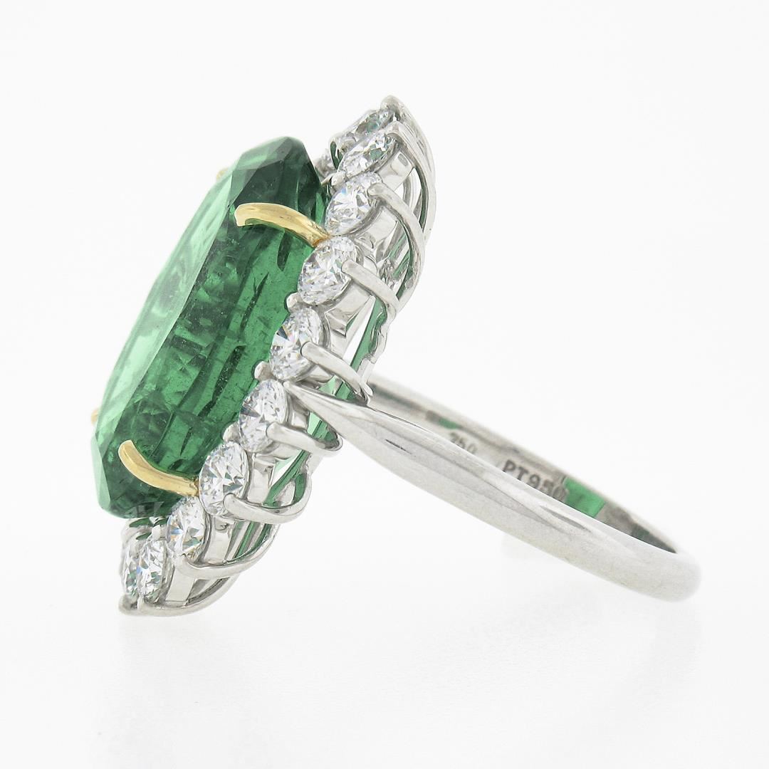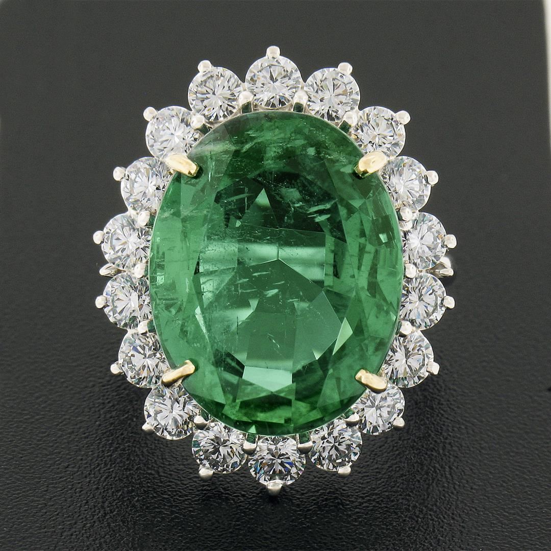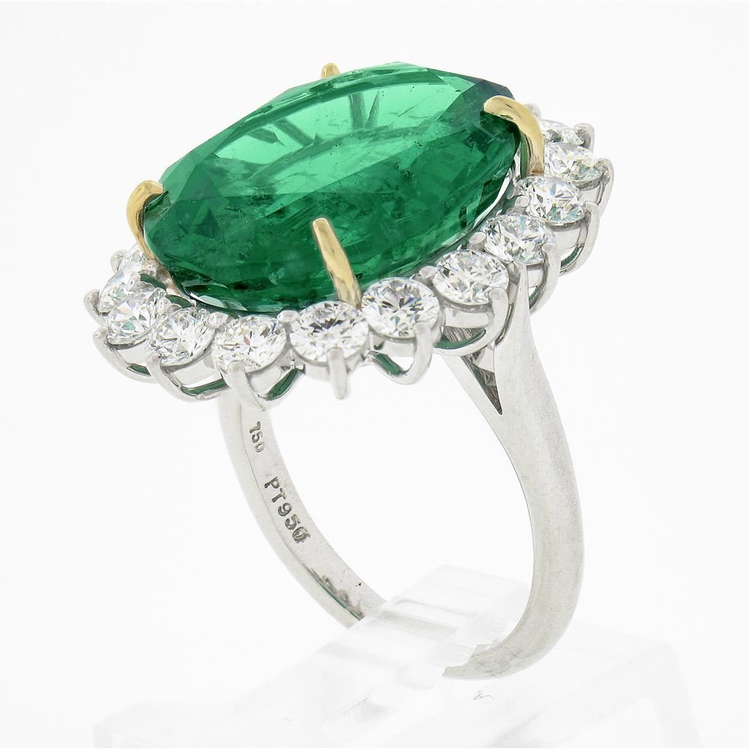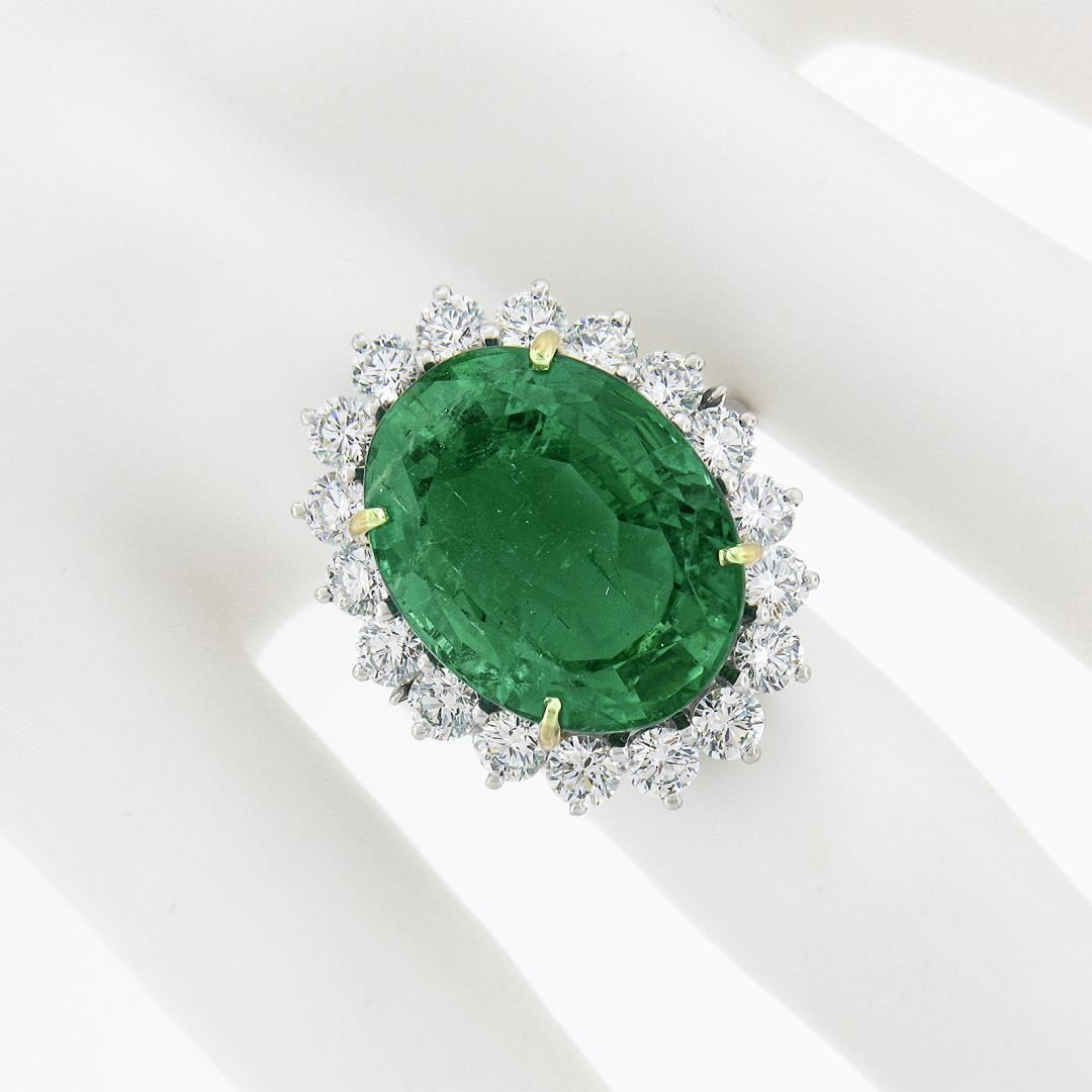 A solid platinum & 18k yellow gold cocktail ring, with 1 AGL graded high quality oval cut natural emerald (14.64ct), and a halo of 18 round brilliant cut natural diamonds (E/F - VVS2/VS1 ; 2.70ctw). The ring is size 7.0, weighs a total of 12.67 grams, and measures 25.85mm wide. Comes with all original relevant certifications.