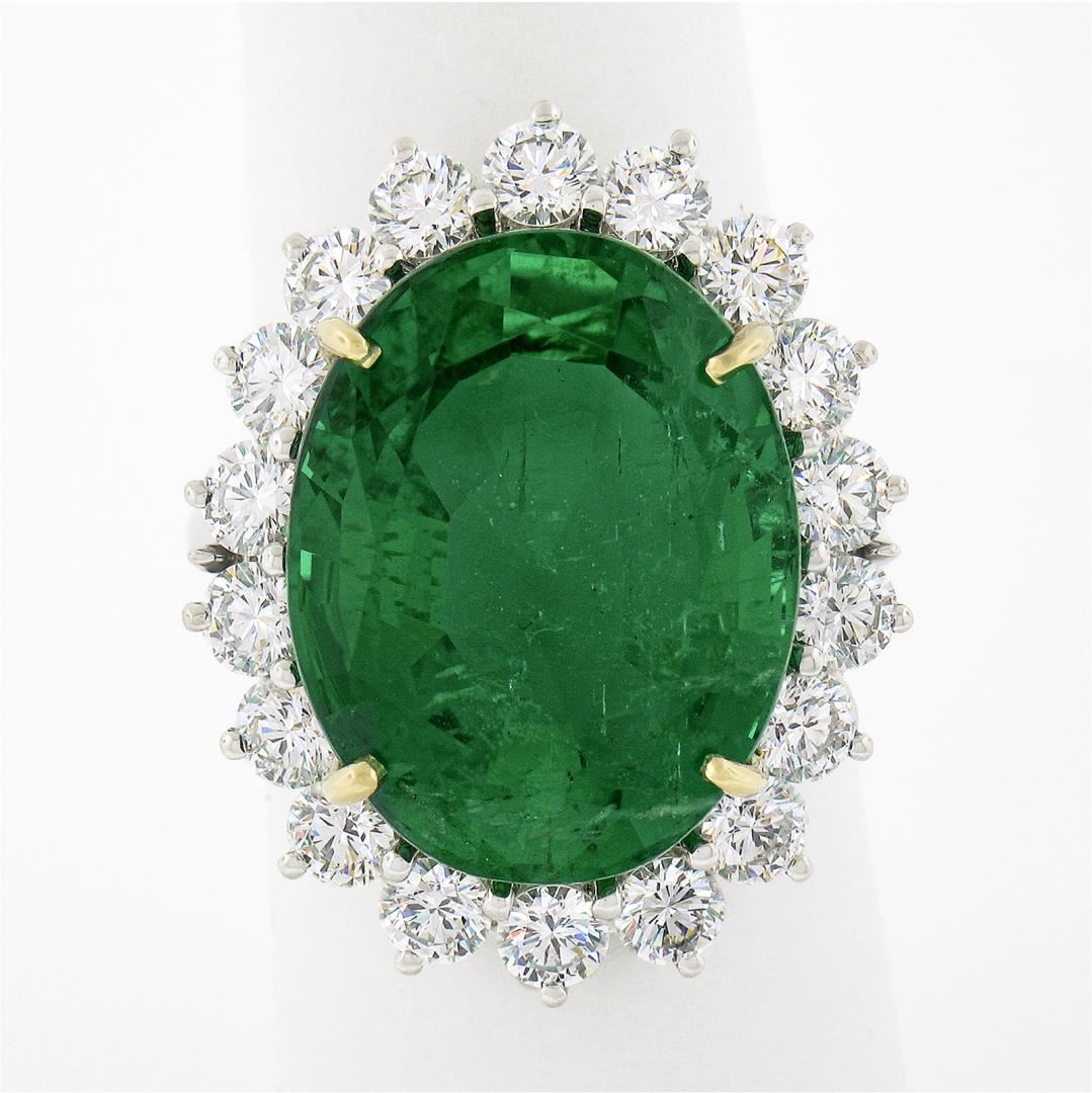 A solid platinum & 18k yellow gold cocktail ring, with 1 AGL graded high quality oval cut natural emerald (14.64ct), and a halo of 18 round brilliant cut natural diamonds (E/F - VVS2/VS1 ; 2.70ctw). The ring is size 7.0, weighs a total of 12.67 grams, and measures 25.85mm wide. Comes with all original relevant certifications.