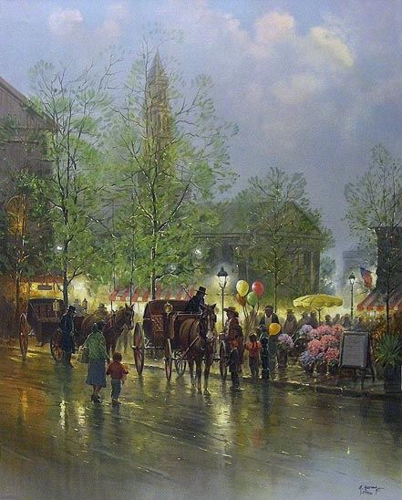 Boston's famous Quincy Market, circa 1910, in the classic style of G.Harvey America. Ltd edition 32x26.5" serigraph on paper. Signed with COA
