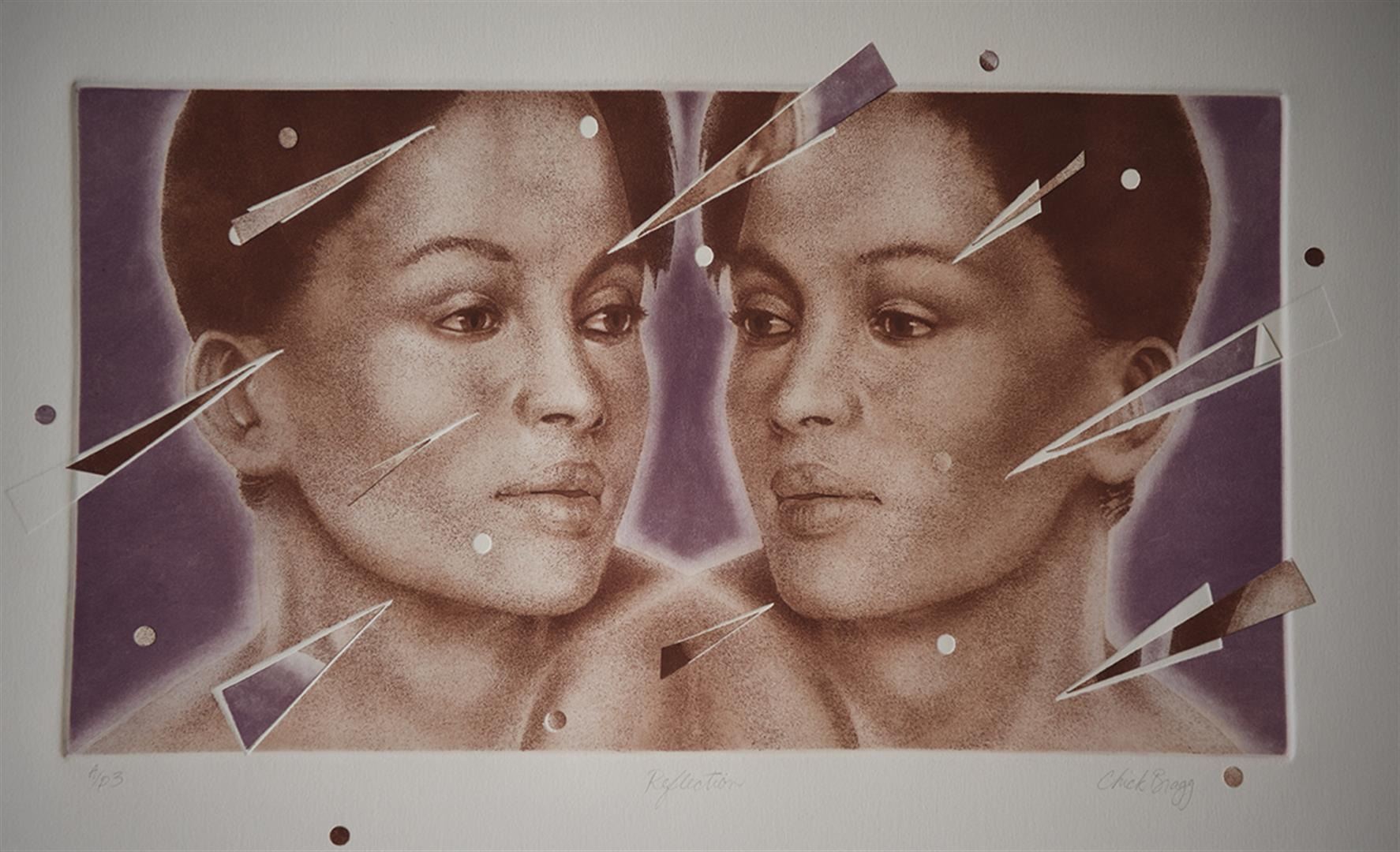 Etching, embossing and collage on paper, limited edition by Charles Lnn Bragg. A Woman takes a moment to consider her options. 18 x 11