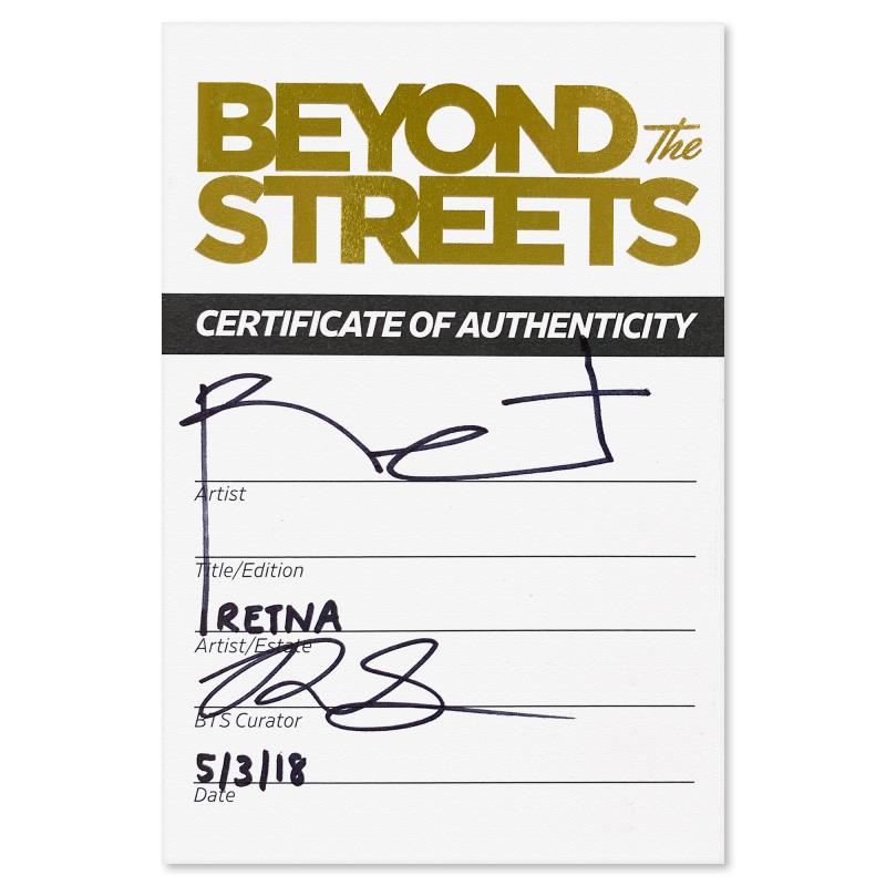 "RETNA Beyond The Streets Skateboard" is a limited edition screen printed skateboard deck by RETNA. This piece comes framed. Includes Certificate of Authenticity from "Beyond The Streets" that is hand signed by the artist. Measures approx. 38" x 14.5" (frame), 32" x 8.5" (image).