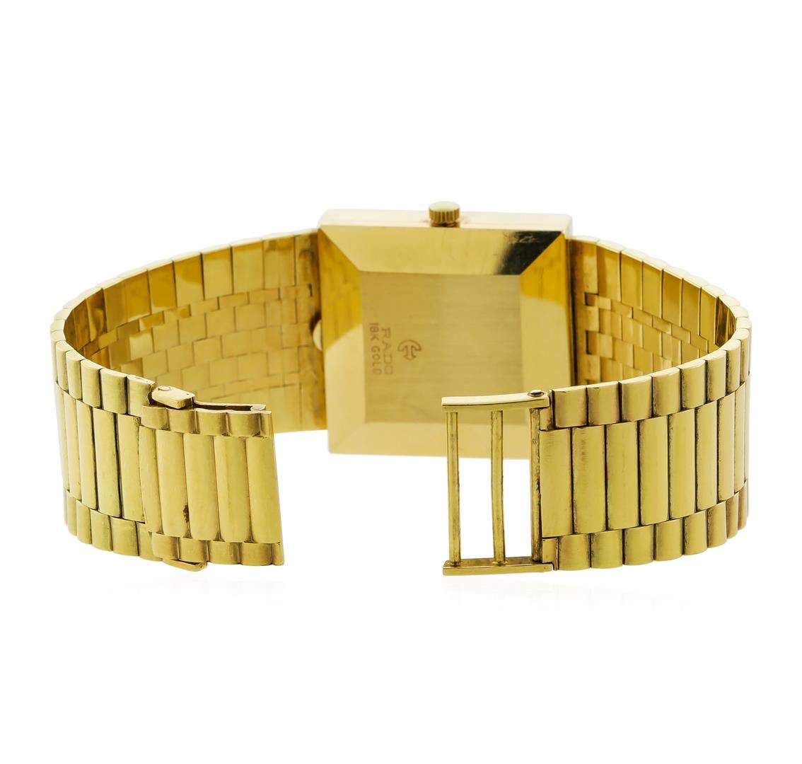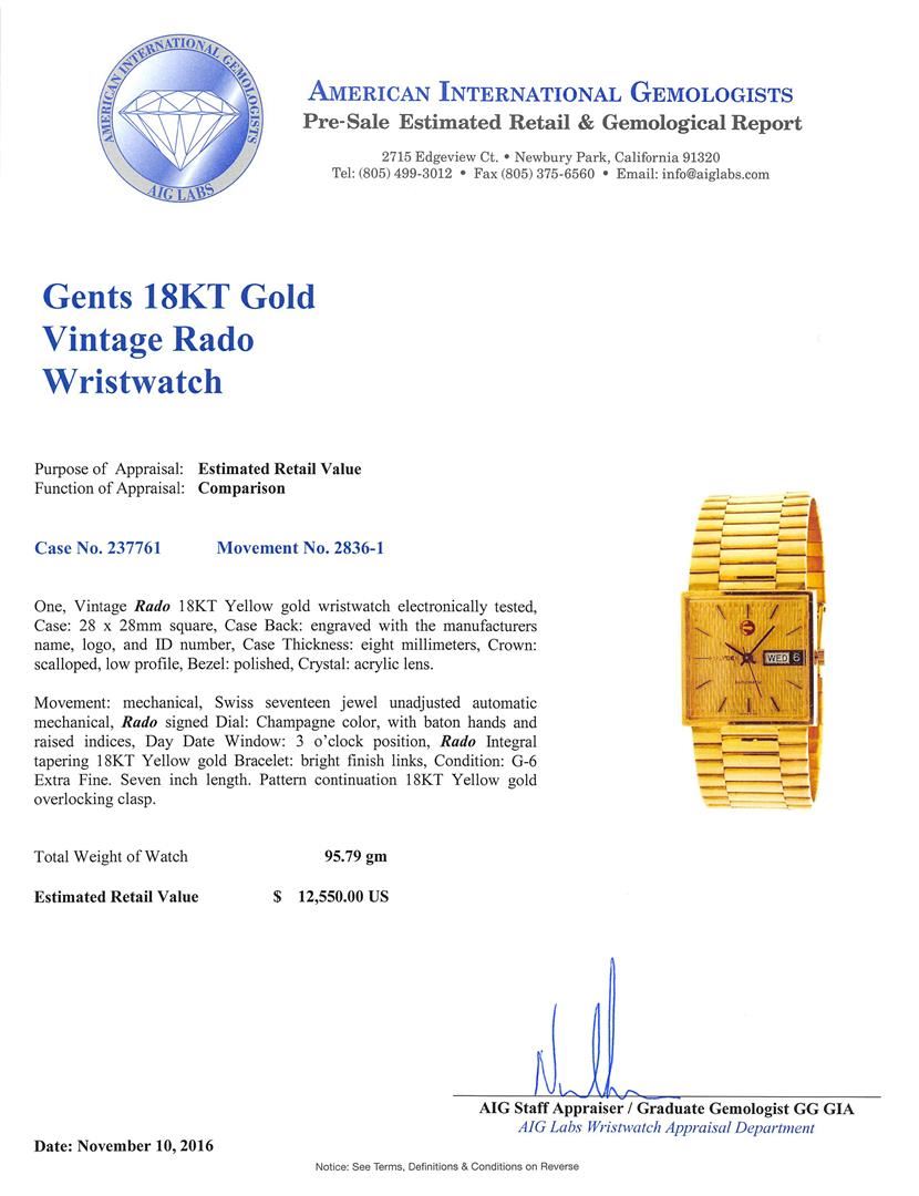 Case Number 237761, Movemnet Number 2836-1. One vintage Rado 18KT yellow gold wristwatch electronically tested, Case: 28 x 28mm square, Case Back: engraved with the manufacturer's name, logo, and ID number, Case Thickness: eight millimeters, Crown: scalloped, low profile, Bezel: polished, Crystal: acrylic lens. Movement: mechanical, Swiss seventeen jewel unadjusted automatic mechanical, Rado signed Dial: Champagne color, with baton hand and raised indices, day-date window at 3 o'clock position, Rado Intergral tapering 18KT yellow gold bracelet: bright finish links, Condition: G-6 Extra Fine. Seven inch length. Pattern continuation 18KT yellow gold overlocking clasp. Total Weight of Watch is 95.79gm. AIG Appraised at $12,550.00. AIG Appraised at $12,550.00.