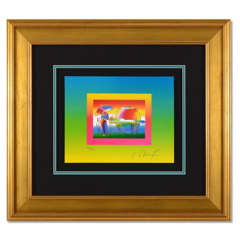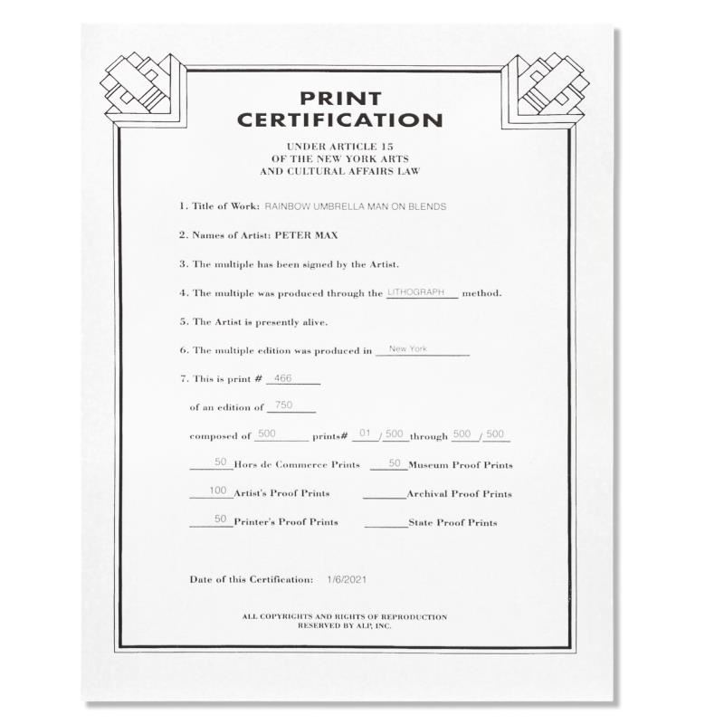 "Rainbow Umbrella Man on Blends" is a limited edition lithograph on paper by Peter Max, numbered 466/500 and hand signed by the artist. This piece comes framed. Includes Certificate of Authenticity from Peter Max Studios. Measures approximately 26" x 23.5" (frame), 13" x 10" (image).