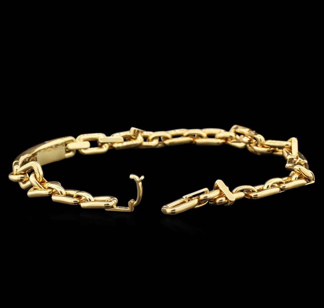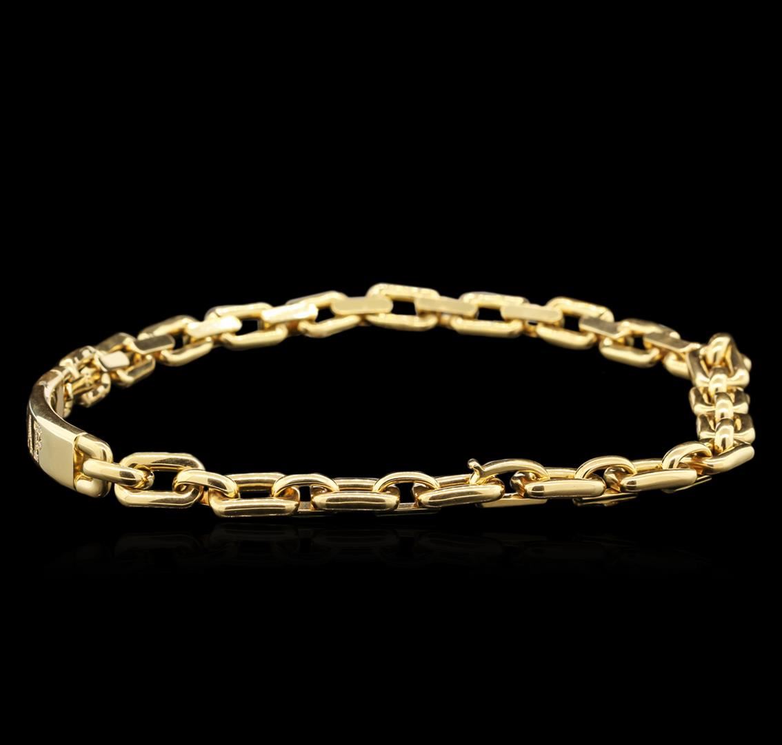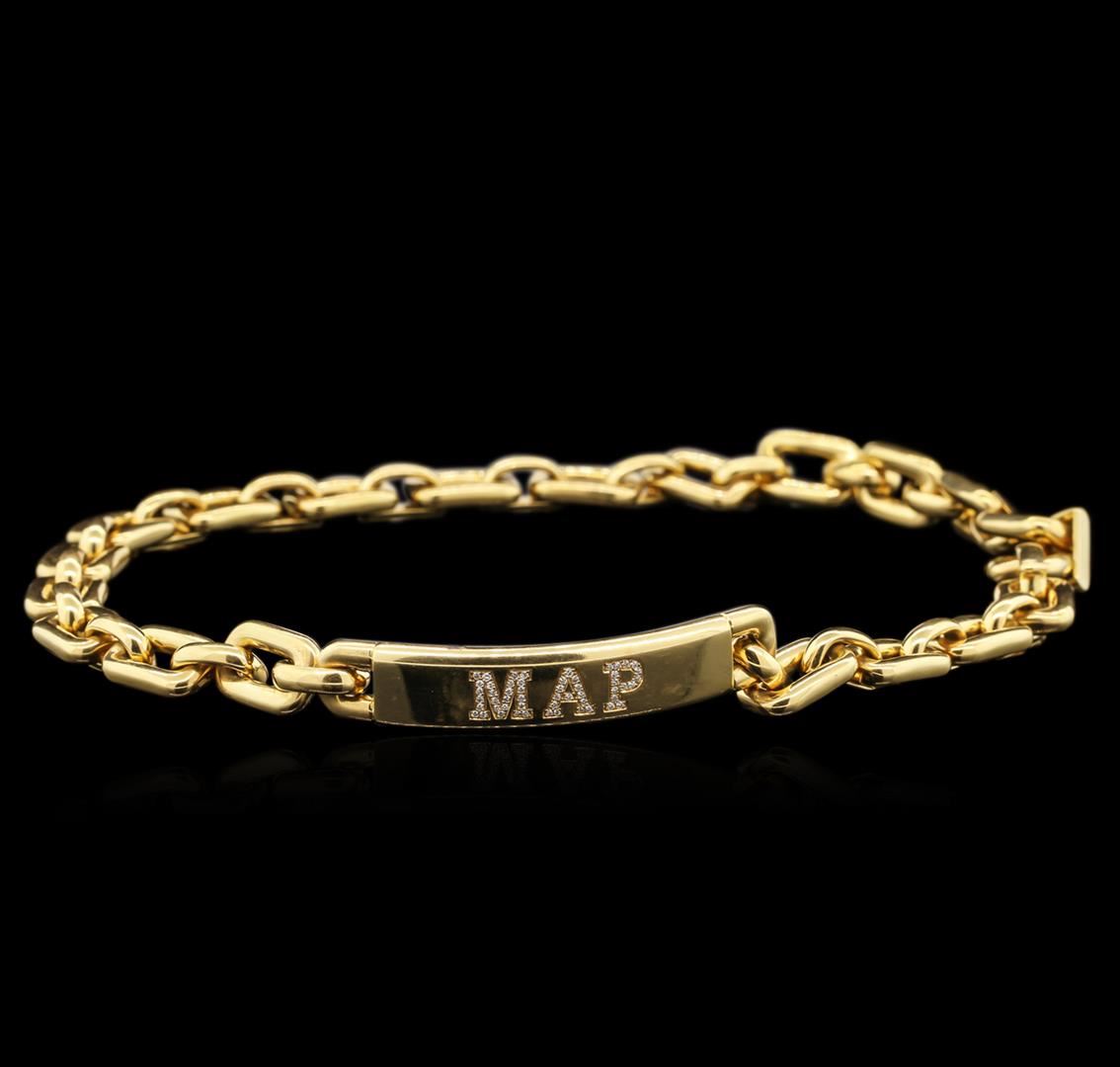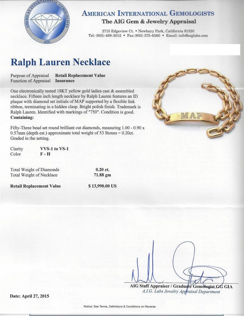 One electronically tested 18KT yellow gold ladies cast & assembled necklace. Fifteen inch length necklace by Ralph Lauren features an ID plaque with diamond set initials of MAP supported by a flexible ink ribbon, terminating in a hidden clasp. Bright polish finish. Trademark is Ralph Lauren. Identified with markings of "750". Condition is good. Containing: Fifty-Three bead set round brilliant cut diamonds, measuring 1.00 - 0.90 x 0.57mm (depth est.) approximate total weight of 53 Stones = 0.20ct. Graded in the setting. Clarity: VVS-1 to VS-1. Color: F - H. Total Weight of Diamonds: 0.20 ct. Total Weight of Necklace: 71.88 gm. AIG Appraised at $13,990.00.