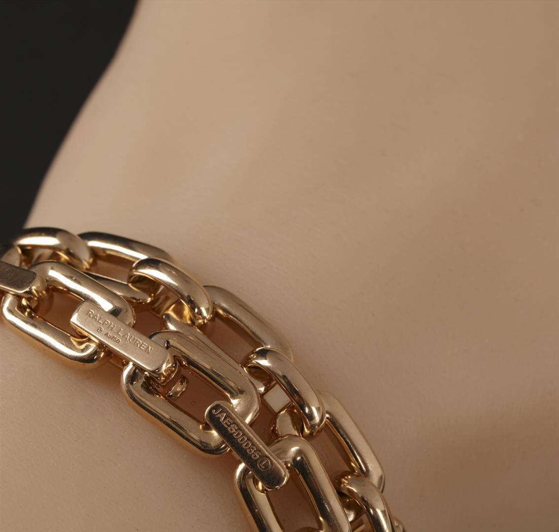 One electronically tested 18KT yellow gold custom cast & assembled convertible necklace/bracelet. The convertible necklace/bracelet is part of Ralph Lauren's Chunky Chain Collection. Measuring fifteen inches in length allows the piece to be worn as a choker style necklace or as a bracelet by wrapping around the wrist twice. The convertible necklace/bracelet features an off-set engravable ID plaque supported by a flexible link ribbon, terminating in a hidden clasp. Bright polish finish. Trademark is Ralph Lauren. Stamped JAES00035. Identified with markings of 750. Condition is good. Total Weight of Necklace/Bracelet 71.15 grams. AIG Appraised at $14,050.00.