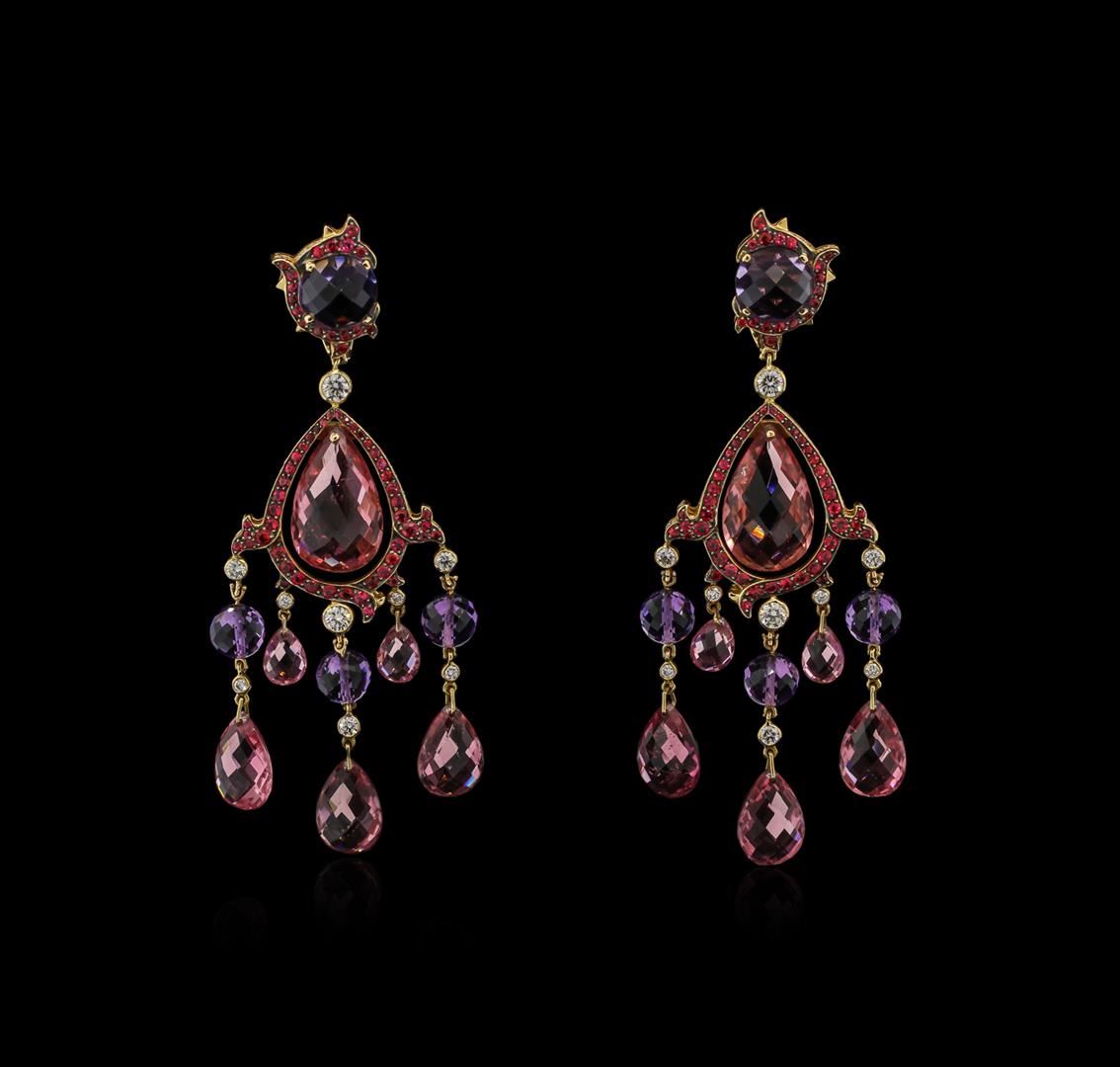 One pair electronically tested 18KT rose gold ladies cast & assembled multi gemstone & diamond dangle earrings with omega backs. Each earring features a floating pink tourmaline set within a red spinel frame supported by pink tourmaline, amethyst and diamond dangles, completed by an amethyst accented by red spinel. The earrings are from Ralph Lauren's New Romantic Collection. Stamped JACV00025. Bright and anodized finish. Trademark is Ralph Lauren. Identified with markings of "750". Condition is good. Containing: Two peg set briolette cut natural pink tourmalines, measuring 16.50 x 10.80 x 5.50mm, approximate total weight of 13.30ct., clarity is eye clean, medium dark, moderately strong, pink color, (GIA Pk 6/4), cut is good. Transmitting light with no distortion, transparent. Color grade is an average for the pair. Graded in the setting. Six peg set briolette cut natural pink tourmalines, measuring 11.50 x 9.00 x 5.00mm, approximate total weight of 21.00ct., clarity is eye clean, medium dark, moderately strong, pink color, (GIA Pk 6/4), cut is good. Transmitting light with no distortion, transparent. Color grade is an average for the group. Graded in the setting. Four peg set briolette cut natural pink tourmalines, measuring 6.00 x 5.00 x 3.50mm, approximate total weight of 3.00ct., clarity is eye clean, medium dark, moderately strong, pink color, (GIA Pk 6/4), cut is good. Transmitting light with no distortion, transparent. Color grade is an average for the group. Graded in the setting. Six peg set briolette cut natural amethysts, measuring 6.50 x 6.45 x 6.50mm, approximate total weight of 9.60ct., clarity is eye clean, type II, medium dark, moderately strong, purple color, (GIA P 6/4), cut is good. Transmitting light with no distortion, transparent. Color grade is an average for the group. Graded in the setting. Two prong set round cabochon cut natural amethysts, measuring 9.00 x 9.00 x 4.95mm, approximate total weight of 5.80ct., clarity is eye clean, type II, medium dark, moderately strong, purple color, (GIA P 6/4), cut is good. Transmitting light with no distortion, transparent. Color grade is an average for the pair. Graded in the setting. One hundred twenty-six bead set round brilliant cut natural red spinels, measuring 1.70 - 1.20 x 0.94 mm, approximate total weight of 1.36ct., clarity is eye clean, medium dark, moderately strong, slightly purplish red color, (GIA slpR 6/4), cut is good. Transmitting light with no distortion, transparent. Color grade is an average for the group. Graded in the setting. Four bezel set round brilliant cut diamonds, measuring 3.30 - 3.20 x 1.95mm (depth est.) approximate total weight of 4 Stones = 0.50ct. Graded in the setting. Clarity: VS-1 to VS-2. Color: G - H. Six bezel set round brilliant cut diamonds, measuring 2.30 - 2.30 x 1.38mm (depth est.) approximate total weight of 6 Stones = 0.30ct. Graded in the setting. Clarity: VS-1 to VS-2. Color: G - H. Eight bezel set round brilliant cut diamonds, measuring 1.80 - 1.80 x 1.08mm (depth est.) approximate total weight of 8 Stones = 0.20ct. Graded in the setting. Clarity: VS-1 to VS-2. Color: G - H. One Hundred Forty-Eight bead set round brilliant cut diamonds, measuring 1.20 - 0.90 x 0.63mm (depth est.) approximate total weight of 148 Stones = 0.75ct. Graded in the setting. Clarity: VVS-2 to VS-1. Color: G - H. Total Weight of Colored Stones: 54.06 ct. Total Weight of Diamonds: 1.75 ct. Total Weight of Earrings: 27.70 gm. AIG Appraised at $35,000.00.
