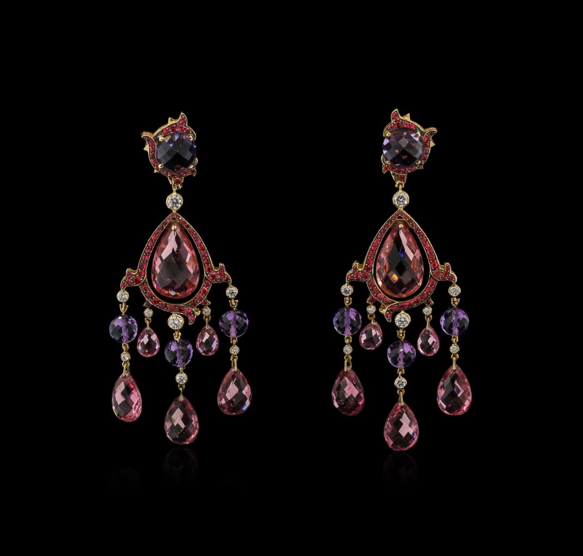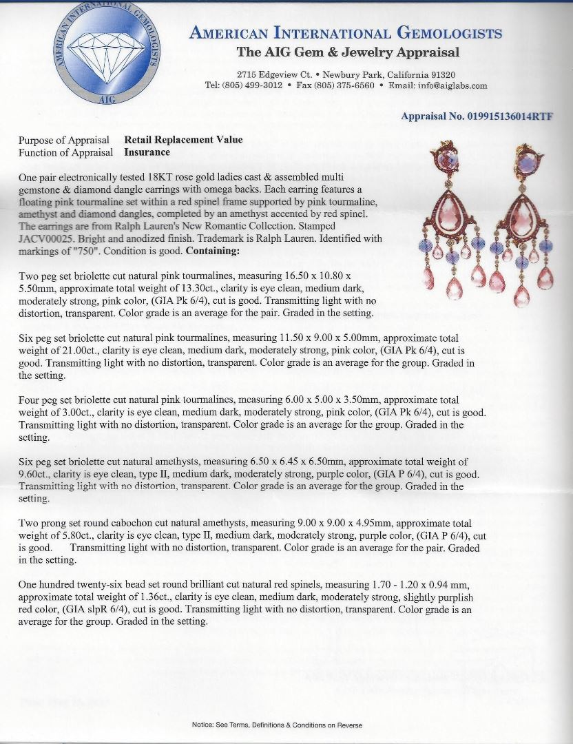 One pair electronically tested 18KT rose gold ladies cast & assembled multi gemstone & diamond dangle earrings with omega backs. Each earring features a floating pink tourmaline set within a red spinel frame supported by pink tourmaline, amethyst and diamond dangles, completed by an amethyst accented by red spinel. The earrings are from Ralph Lauren's New Romantic Collection. Stamped JACV00025. Bright and anodized finish. Trademark is Ralph Lauren. Identified with markings of "750". Condition is good. Containing: Two peg set briolette cut natural pink tourmalines, measuring 16.50 x 10.80 x 5.50mm, approximate total weight of 13.30ct., clarity is eye clean, medium dark, moderately strong, pink color, (GIA Pk 6/4), cut is good. Transmitting light with no distortion, transparent. Color grade is an average for the pair. Graded in the setting. Six peg set briolette cut natural pink tourmalines, measuring 11.50 x 9.00 x 5.00mm, approximate total weight of 21.00ct., clarity is eye clean, medium dark, moderately strong, pink color, (GIA Pk 6/4), cut is good. Transmitting light with no distortion, transparent. Color grade is an average for the group. Graded in the setting. Four peg set briolette cut natural pink tourmalines, measuring 6.00 x 5.00 x 3.50mm, approximate total weight of 3.00ct., clarity is eye clean, medium dark, moderately strong, pink color, (GIA Pk 6/4), cut is good. Transmitting light with no distortion, transparent. Color grade is an average for the group. Graded in the setting. Six peg set briolette cut natural amethysts, measuring 6.50 x 6.45 x 6.50mm, approximate total weight of 9.60ct., clarity is eye clean, type II, medium dark, moderately strong, purple color, (GIA P 6/4), cut is good. Transmitting light with no distortion, transparent. Color grade is an average for the group. Graded in the setting. Two prong set round cabochon cut natural amethysts, measuring 9.00 x 9.00 x 4.95mm, approximate total weight of 5.80ct., clarity is eye clean, type II, medium dark, moderately strong, purple color, (GIA P 6/4), cut is good. Transmitting light with no distortion, transparent. Color grade is an average for the pair. Graded in the setting. One hundred twenty-six bead set round brilliant cut natural red spinels, measuring 1.70 - 1.20 x 0.94 mm, approximate total weight of 1.36ct., clarity is eye clean, medium dark, moderately strong, slightly purplish red color, (GIA slpR 6/4), cut is good. Transmitting light with no distortion, transparent. Color grade is an average for the group. Graded in the setting. Four bezel set round brilliant cut diamonds, measuring 3.30 - 3.20 x 1.95mm (depth est.) approximate total weight of 4 Stones = 0.50ct. Graded in the setting. Clarity: VS-1 to VS-2. Color: G - H. Six bezel set round brilliant cut diamonds, measuring 2.30 - 2.30 x 1.38mm (depth est.) approximate total weight of 6 Stones = 0.30ct. Graded in the setting. Clarity: VS-1 to VS-2. Color: G - H. Eight bezel set round brilliant cut diamonds, measuring 1.80 - 1.80 x 1.08mm (depth est.) approximate total weight of 8 Stones = 0.20ct. Graded in the setting. Clarity: VS-1 to VS-2. Color: G - H. One Hundred Forty-Eight bead set round brilliant cut diamonds, measuring 1.20 - 0.90 x 0.63mm (depth est.) approximate total weight of 148 Stones = 0.75ct. Graded in the setting. Clarity: VVS-2 to VS-1. Color: G - H. Total Weight of Colored Stones: 54.06 ct. Total Weight of Diamonds: 1.75 ct. Total Weight of Earrings: 27.70 gm. AIG Appraised at $35,000.00.