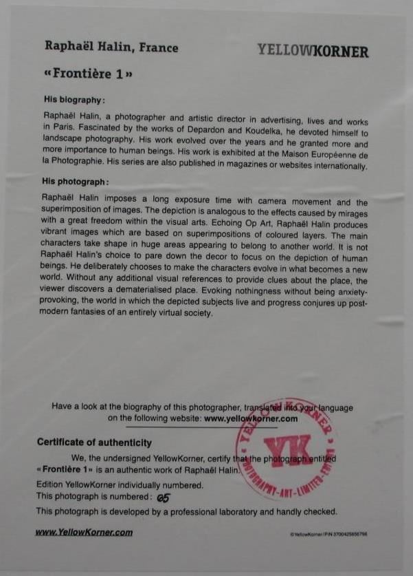 Frontiere 1 Certified Photograph, Raphael Halin YellowKorner Certified Photograph. Certificate of Authenticity from YellowKorner affixed to the back. Matted Dimensions 16"x20". Protected with Clear Mylar Sleeve.