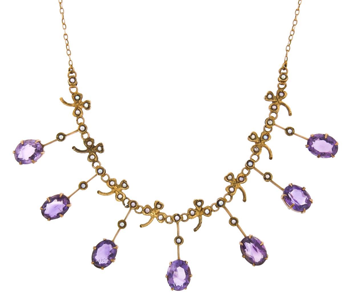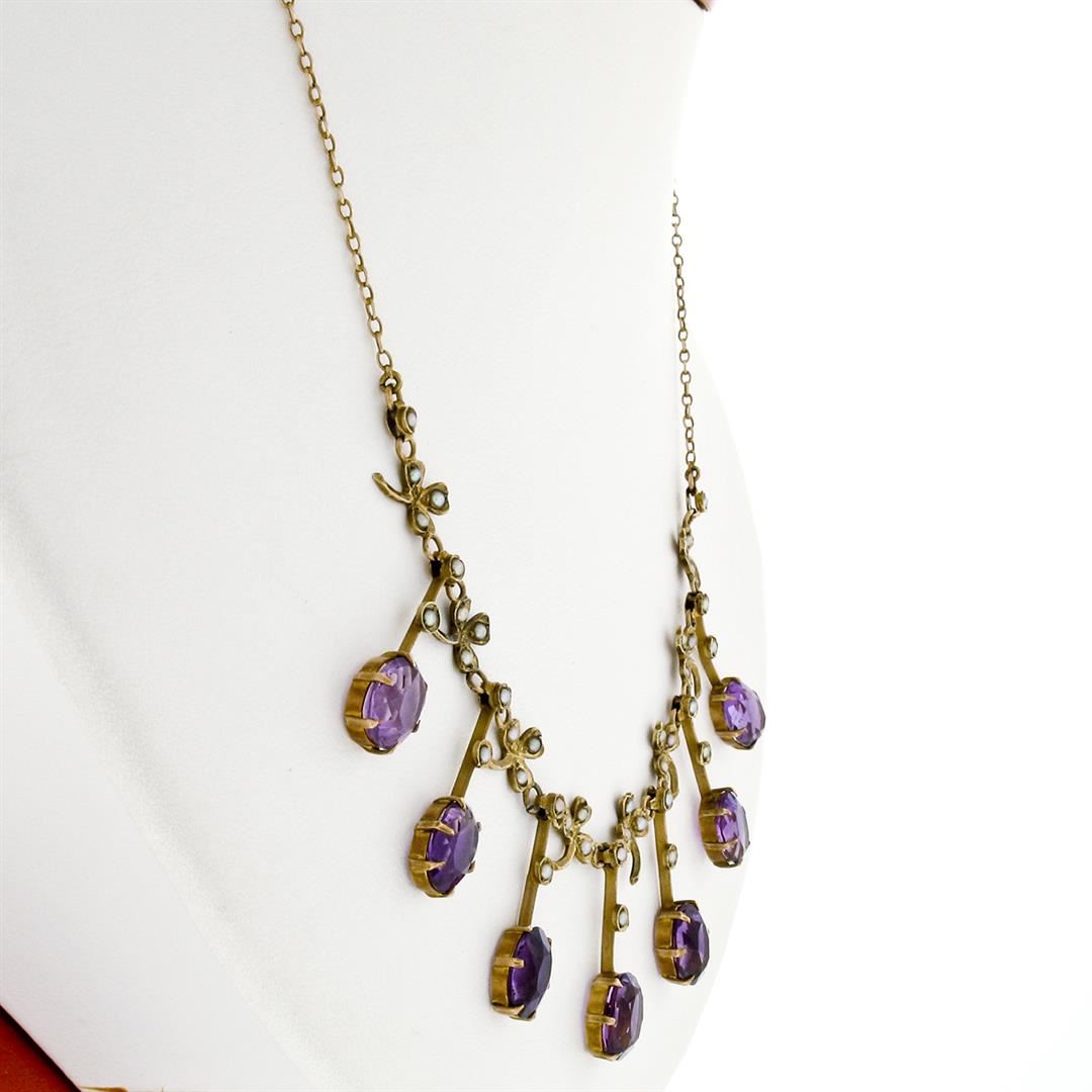 An antique victorian solid 14k yellow gold collier necklace, with 7 oval cut natural amethyst (9.0x7.0mm- 14.0ctw), and 40 round shape natural seed pearls (1.55mm ). 18 inch cable link chain, 9.91 grams total weight, pendant measures 22.50x85.0mm.
