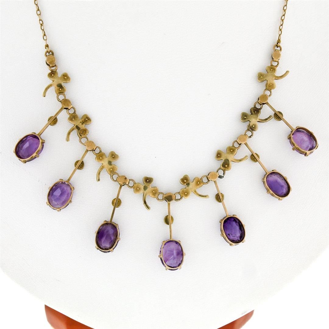 An antique victorian solid 14k yellow gold collier necklace, with 7 oval cut natural amethyst (9.0x7.0mm- 14.0ctw), and 40 round shape natural seed pearls (1.55mm ). 18 inch cable link chain, 9.91 grams total weight, pendant measures 22.50x85.0mm.