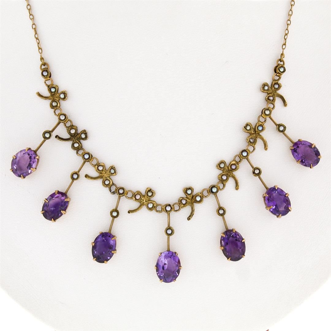 An antique victorian solid 14k yellow gold collier necklace, with 7 oval cut natural amethyst (9.0x7.0mm- 14.0ctw), and 40 round shape natural seed pearls (1.55mm ). 18 inch cable link chain, 9.91 grams total weight, pendant measures 22.50x85.0mm.