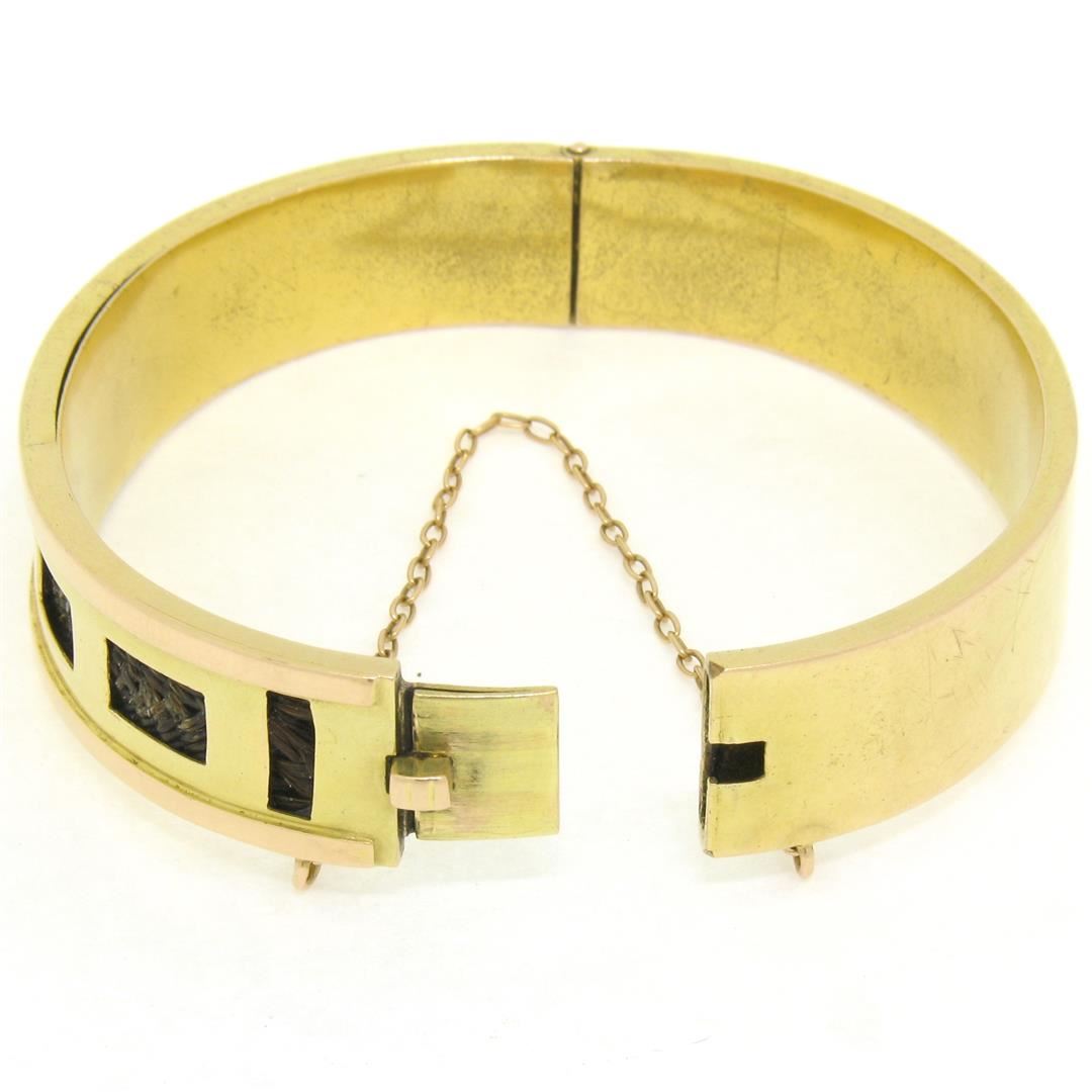 Rare Antique Victorian 14K Green & Rose Gold Mourning Hair Wide Bangle Bracelet. Please see photos and description for all available information. An antique victorian solid 14k green and yellow gold mourning hair bangle bracelet. It weighs a total of 21.0 grams, measures 12.45mm wide, and measures 6.25 inches in length.