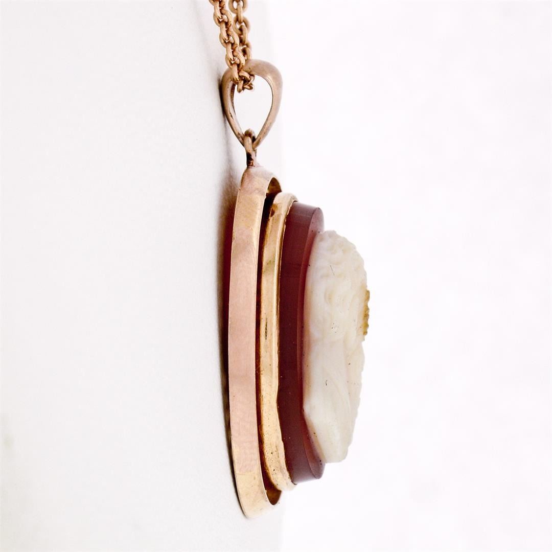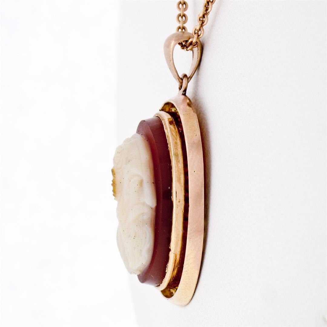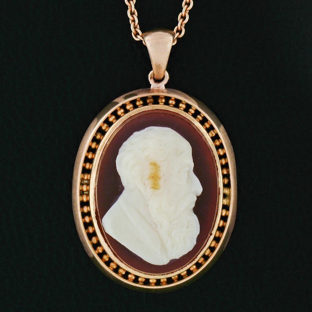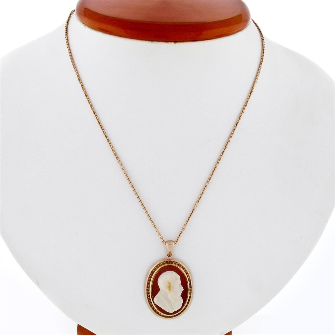 Rare Antique Victorian 14K Rose Gold Raised Carved Agate Cameo Open Work Pendant. A rare Victorian era solid 14k rose gold pendant necklace featuring a carved natural agate cameo (14.85x19.75mm) surrounded by an open bead work frame. 18 inch cable link chain, 8.81 grams total weight, pendant measures 31.8x20.2mm.