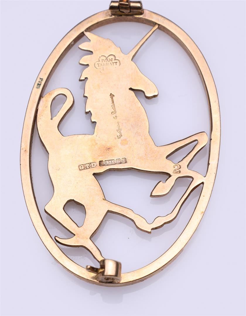 A rare vintage yellow gold European pen back brooch in openwork design depicting a well modeled unicorn, the yellow gold stamped with makers mark for designer Ivan Tarratt together with British hallmarks and date stamps; gross weight 13.7 g, 2" x 1 1/4" (