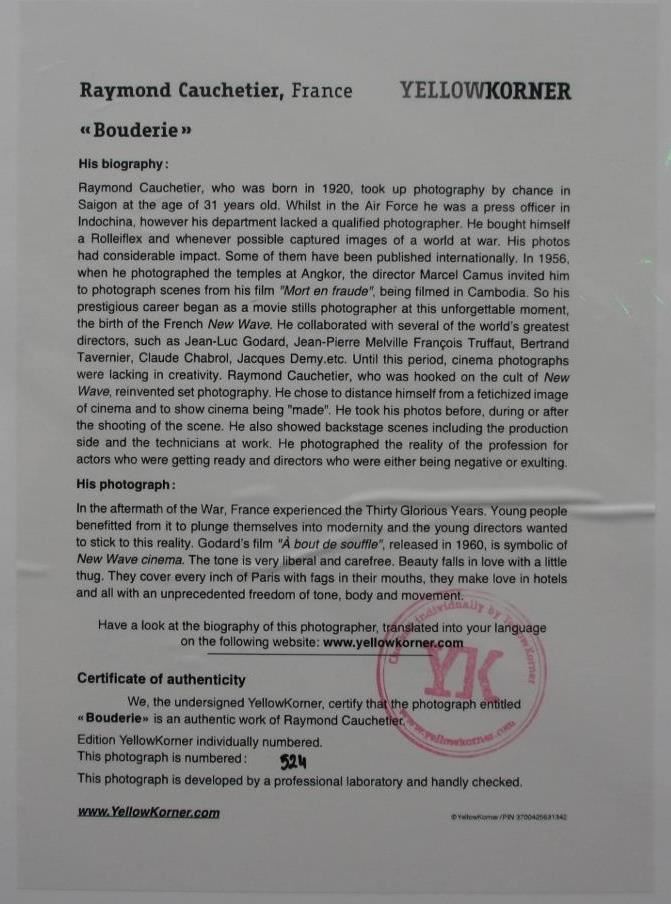 Bouderie Certified Photograph, Raymond Cauchetier YellowKorner Certified Photograph. Certificate of Authenticity from YellowKorner affixed to the back. Matted Dimensions 16"x20". Protected with Clear Mylar Sleeve.