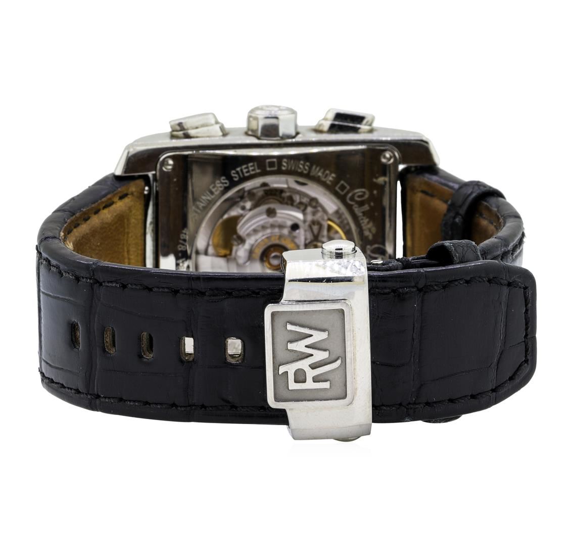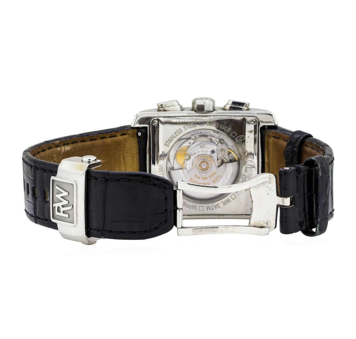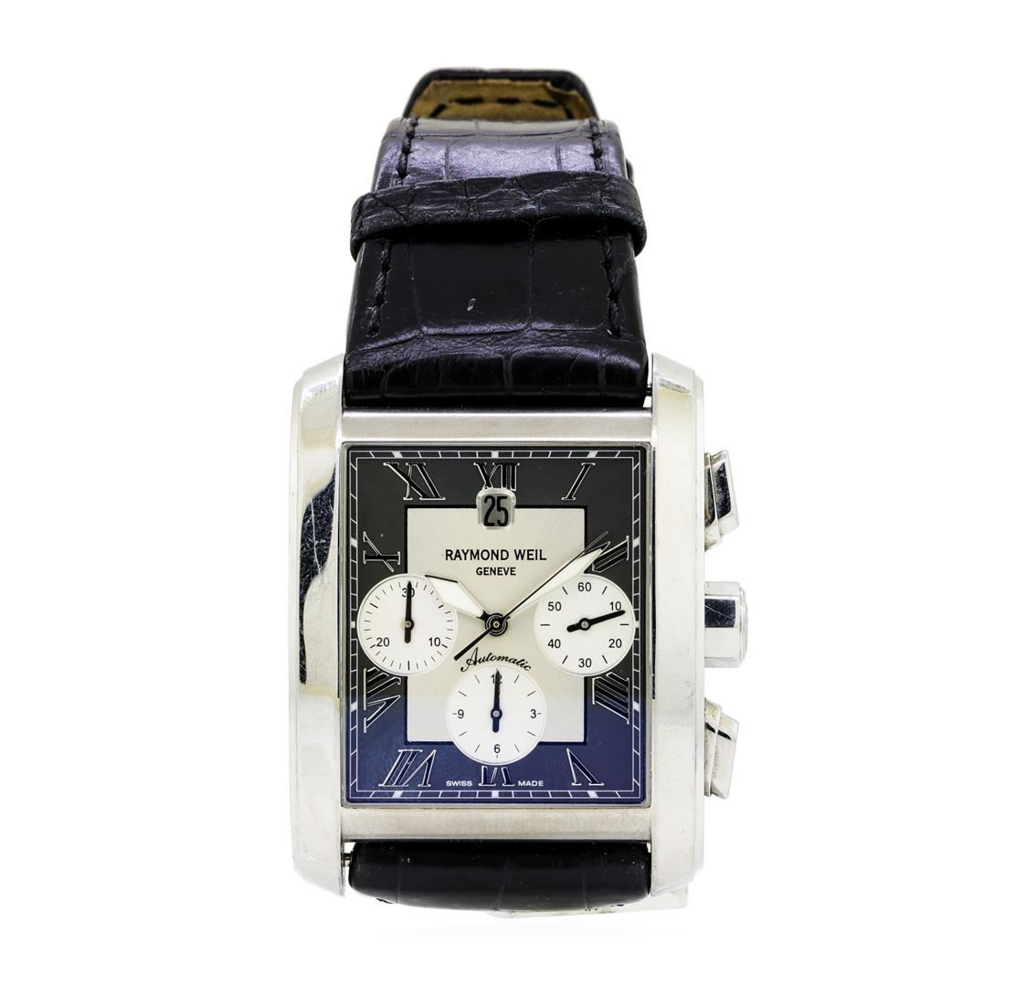 One Raymond Weil Don Giovanni Cosi Grande stainless steel wristwatch featuring: grey rectangle dial with luminous hands, a date indicator at the 12 o'clock hour marker, three sub-dials (sixty seconds, thirty minutes and twelve hours). The watch features a scratch-resistant sapphire crystal and is water resistant up to thirty meters. The strap is black alligator leather with a single deployment clasp. The watch and strap weigh a total of 122.5 grams.