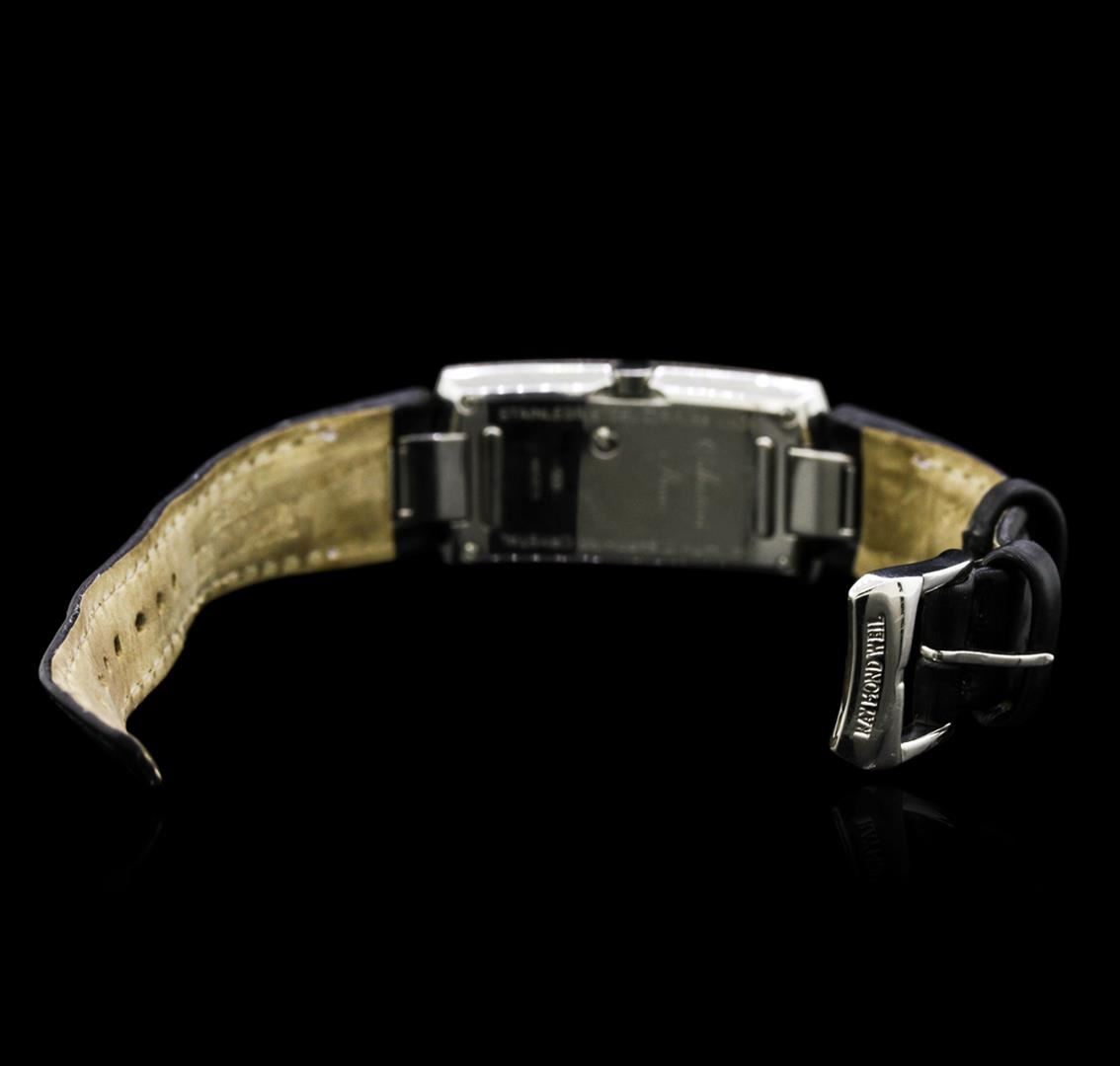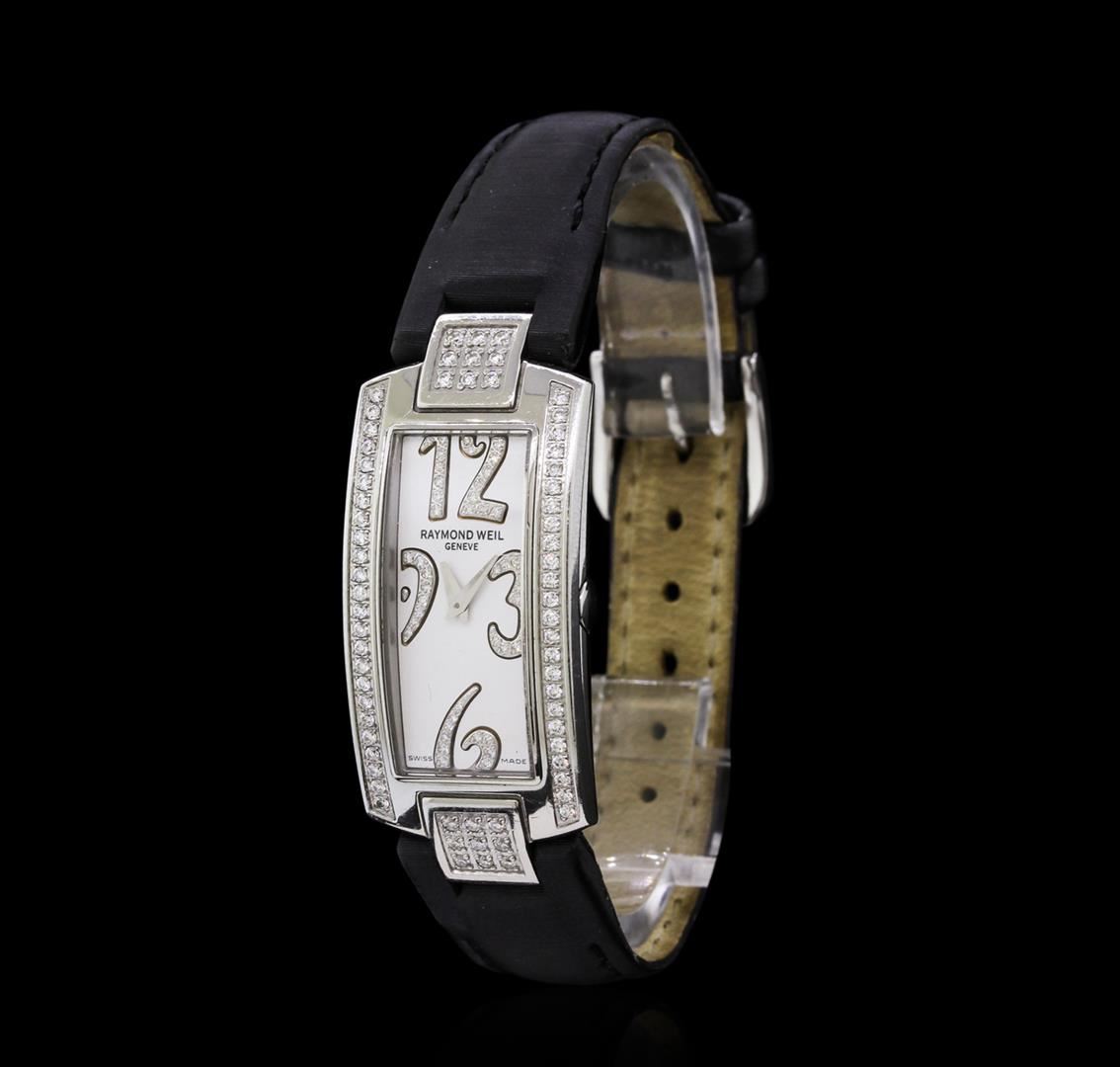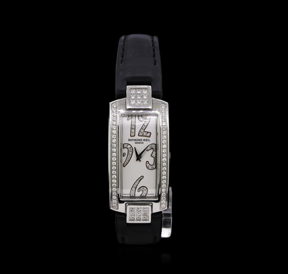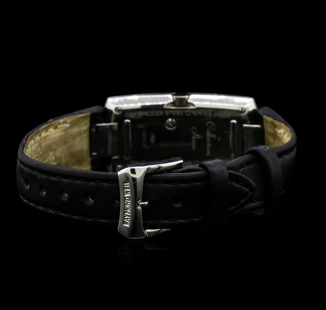 One Raymond Weil Stainless Steel Diamond Ladies Watch featuring: Movement: Swiss quartz. Case: Stainless steel. Bezel: Stainless steel set with diamonds. Sapphire crystal. Dial: White color. Diamond set 3, 6, 9, and 12 o'clock hour markers. Bracelet: Black leather. Clasp: Buckle.