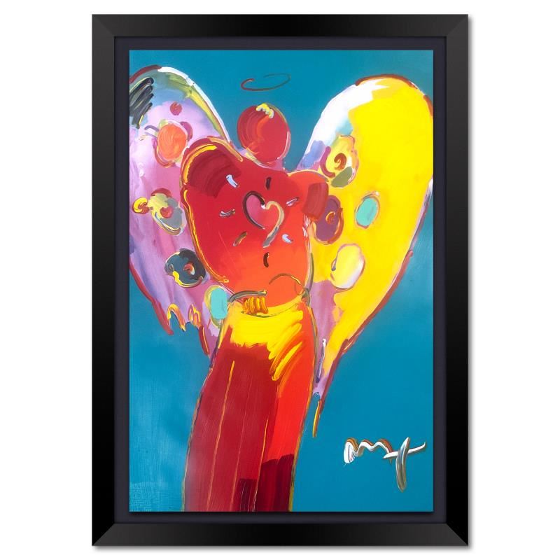 "Red Angel with Heart" is a one-of-a-kind acrylic mixed media on paper, hand signed by Peter Max. The piece comes custom framed with a backside cutout to display Peter Max Studio registration number 255825 certifying authenticity. Measures approx. 42" x 30" (frame), 36" x 24" (image).