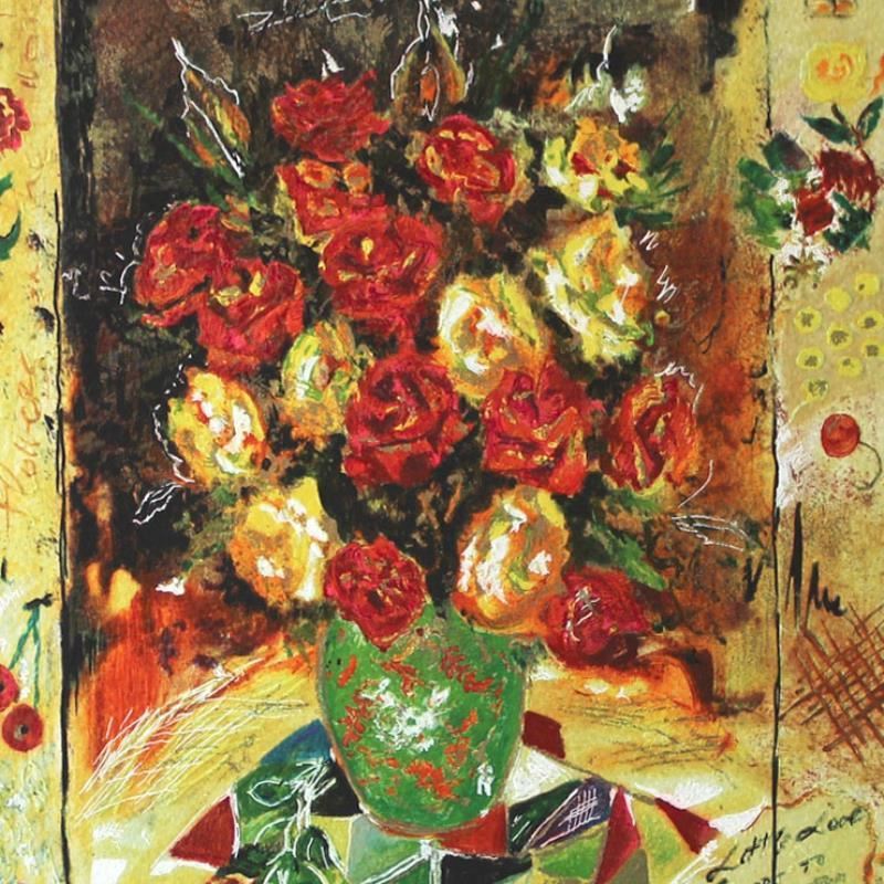"Red Bouquet" is a limited edition Serigraph on Paper by Sergey Kovrigo. The piece is numbered, hand signed by the artist, and come with a letter of authenticity. Measures approximately 13" x 10".