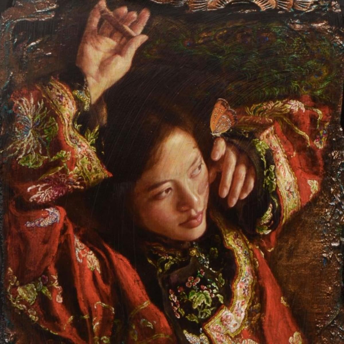 Red Butterfly by Tsui, George. "Red Butterfly" is a limited edition chiarograph on black paper by George Tsui, numbered and hand signed by the artist. Includes Letter of Authenticity. Measures approx. 18" x 24" (border); 13" x 20" (image). Due to the nature of the paper, there may be very minor scuffs in the border area that may be concealed when framed.