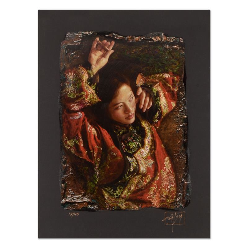 "Red Butterfly" is a limited edition chiarograph on black paper by George Tsui, numbered and hand signed by the artist. Includes Letter of Authenticity. Measures approx. 18" x 24" (border); 13" x 20" (image). Due to the nature of the paper, there may be very minor scuffs in the border area that may be concealed when framed.