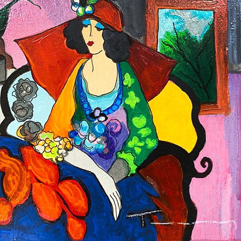 Red Hat is a one-of-a-kind mixed media over paint on wood by Itzchak Tarkay (1935-2012), hand signed by the artist. Includes Letter of Authenticity. Measures approx. 9 x 12 (image).