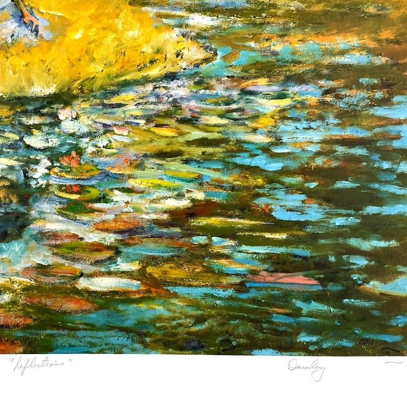 Reflections by Dawley, Joseph. "Reflections" is a limited edition lithograph on paper by Joseph Dawley (1936-2008), numbered and hand signed by the artist. Includes Letter of Authenticity. Measures approx. 26" x 22" (border), 21.5" x 17" (image). There may be minor imperfections in the white border area but the piece is in overall good condition.
