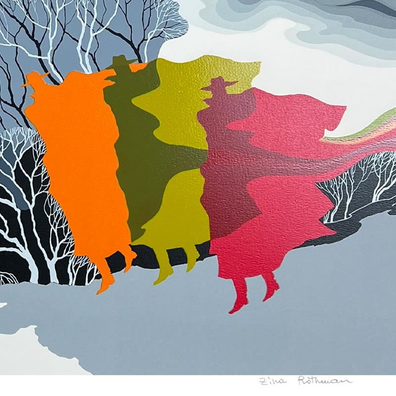 Remembers is a limited edition serigraph on paper by Zina Roitman. The piece comes hand signed by the artist, numbered, and with a letter of authenticity. Measures approximately 19 x 26.