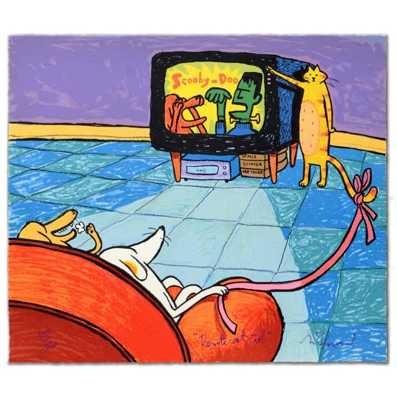 "Remote Cat-trol" is a limited edition hand pulled original lithograph on museum quality deckle-edge paper, numbered and hand signed by Matt Rinard. Includes Certificate of Authenticity! Measures approx. 15" x 13" (image). This lithograph was created on a rare antique Marinoni Voirin French press that dates back to the 1800's. It provides highly pigmented inks that will resist fading and preserve the integrity of the print for more than a lifetime. This process is the most elaborate, costly and effective way to reproduce art while maintaining the brilliance and accuracy of the original creation.