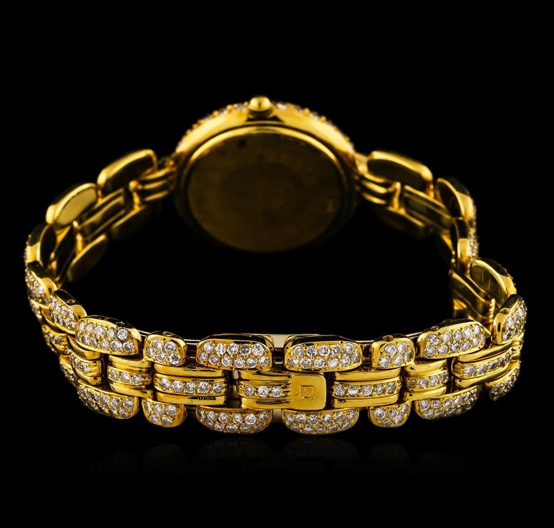 One ladies, Renato Ferraris wristwatch electronically tested 18KT yellow gold, Case, 24mm diameter, Case Back: engraved with the manufacturers name and logo, Bezel: diamond set, Crystal: synthetic sapphire, Movement: quartz. Dial: pave, set diamonds, Bracelet: 18KT yellow gold, flexible links, twelve millimeter width, set throughout with diamonds, Condition: G-5 Fine. Six and one half inch length. Concealed deployment clasp. Containing: Approximately Five Hundred Twenty Five pave, set round brilliant cut diamonds, approximate total weight = 4.00ct. Graded in the setting. Clarity: VS-1 to SI-2. Color: F - H. Total Weight of Diamonds 4.00ct. Total Weight of Watch 66.89 grams. AIG Appraised at $17,880.00.